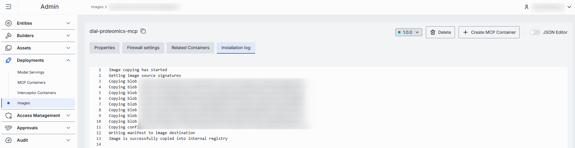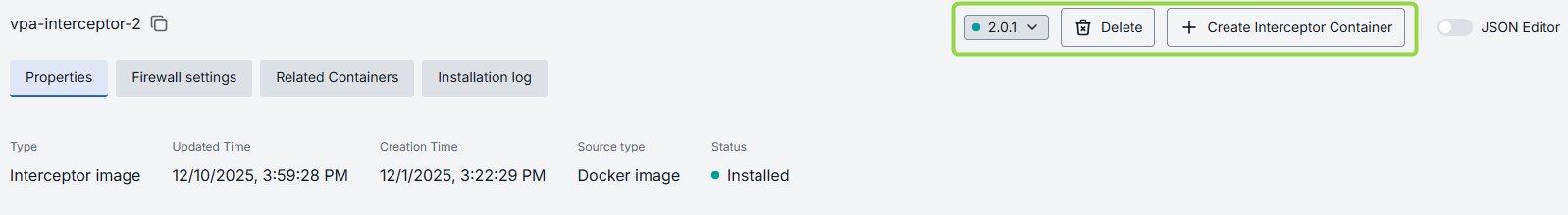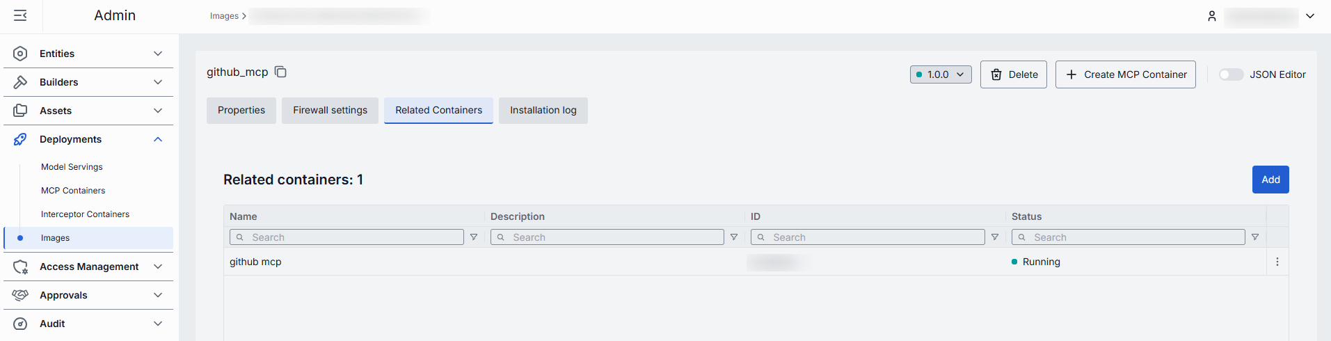 | Create Interceptor/MCP/Adapter Container | Enabled for the installed images. Click to create a new MCP, Adapter or Interceptor container based on the selected image. |
