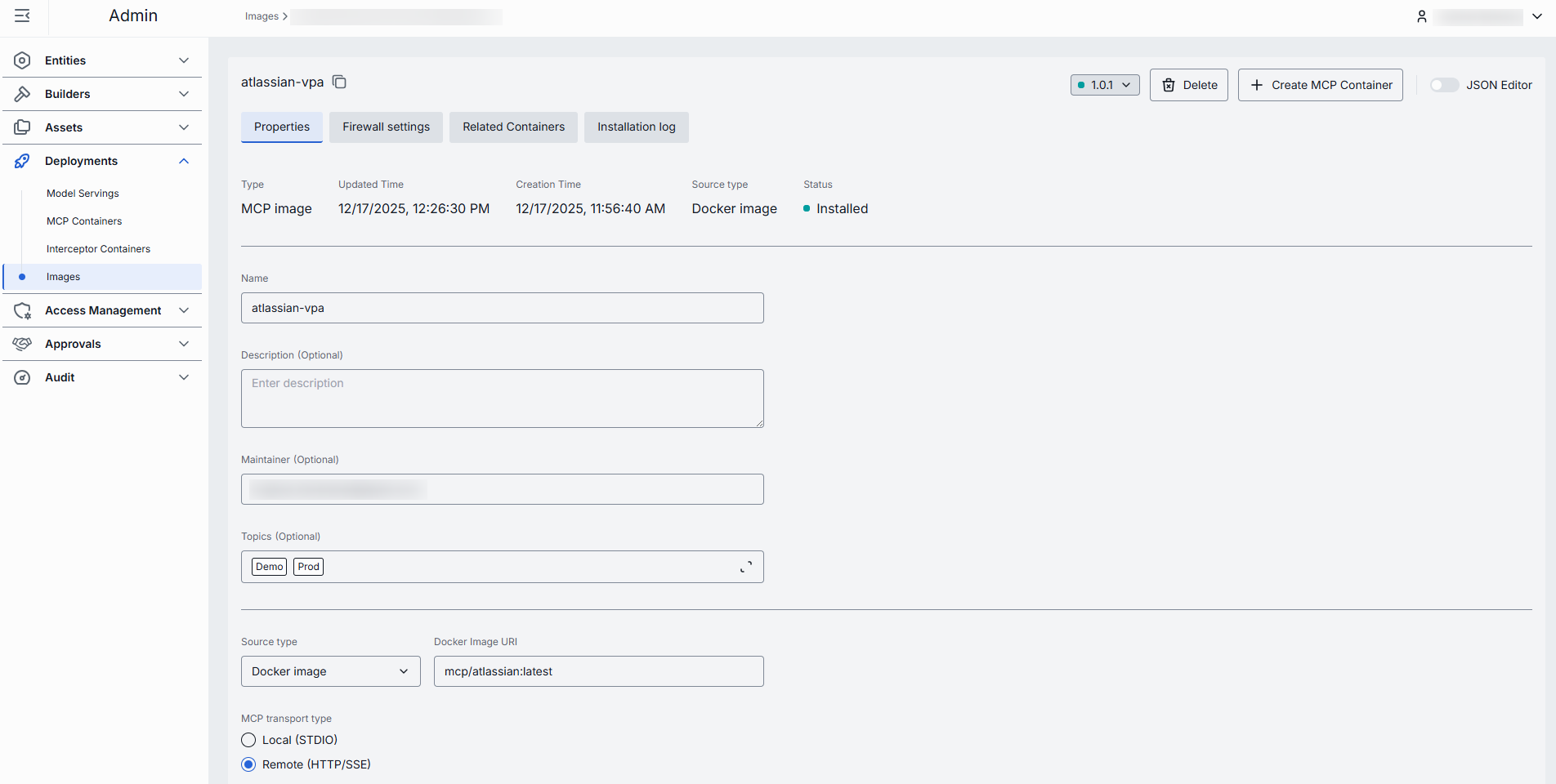 | MCP transport type | Conditional | Yes | Applies only to MCP type of image. The transport type used by the MCP image: - Remote: HTTP (default), SSE (deprecated) - Local (STDIO) |