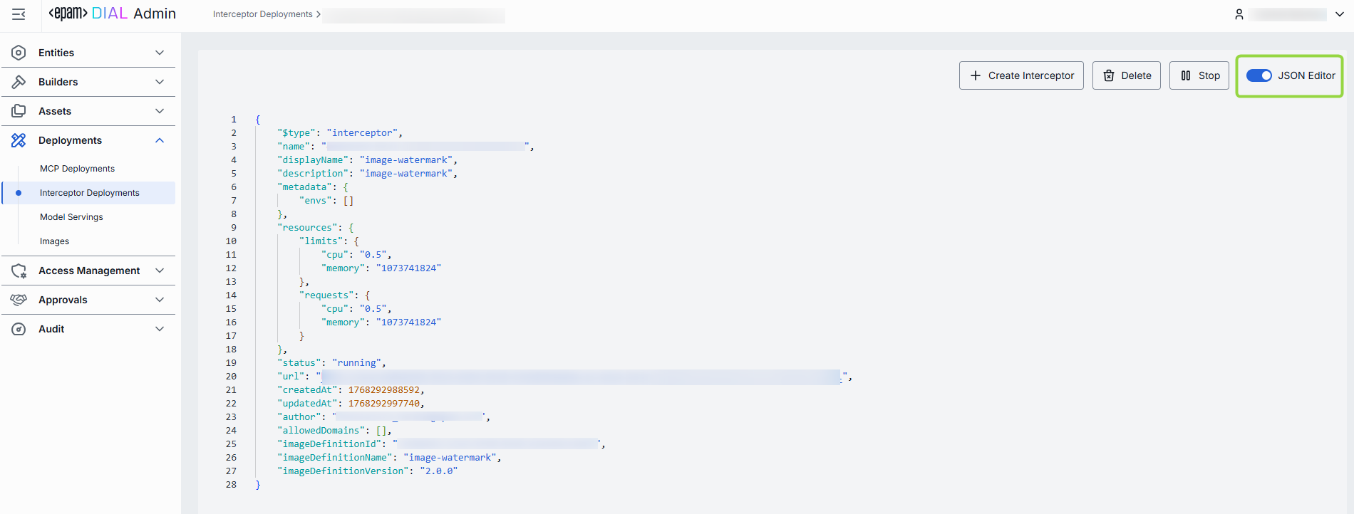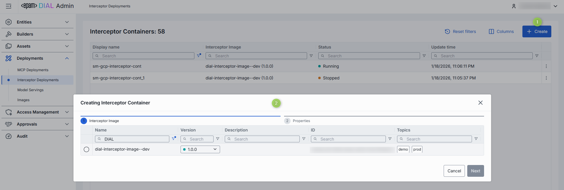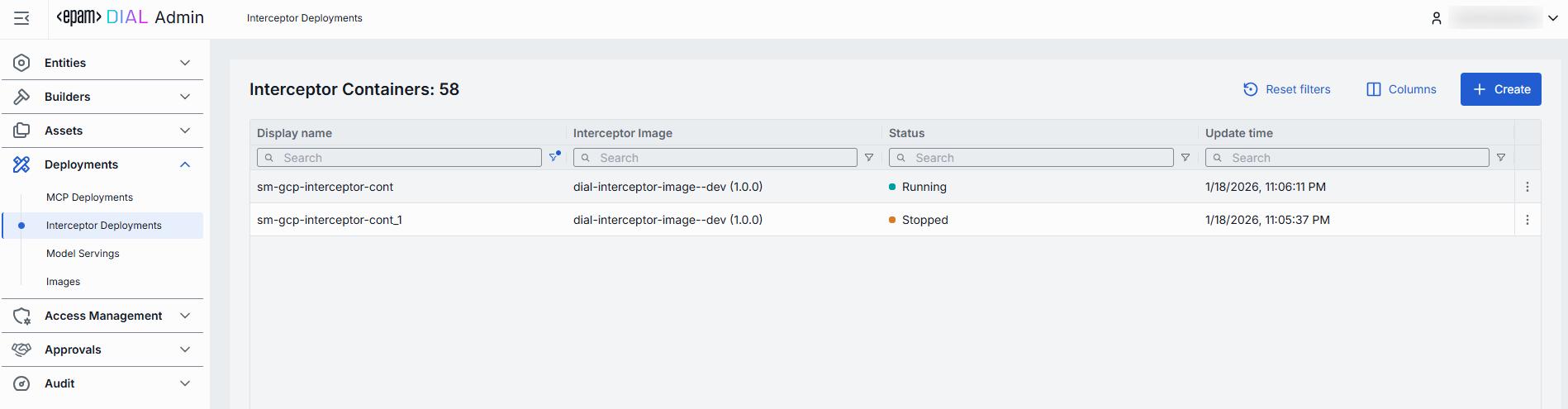 You can use a running interceptor container to create a new interceptor in DIAL. Once created, the interceptor appears in Entities/Interceptors and can be used by DIAL applications, tool and models or as a global interceptor.