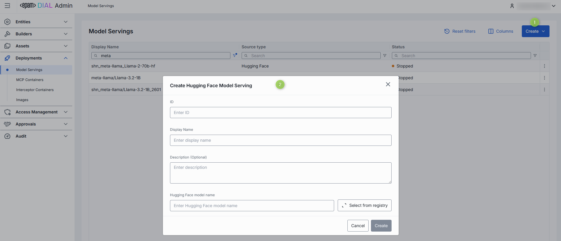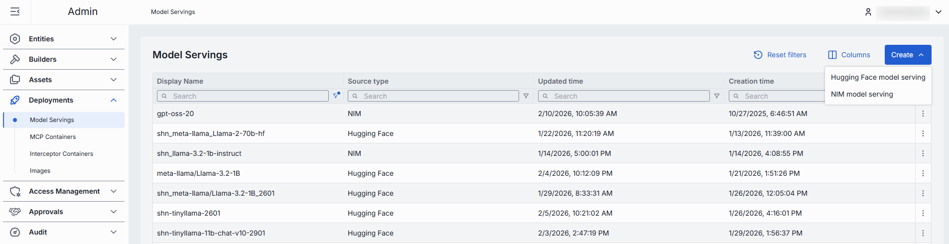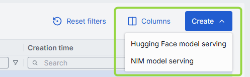 On the main screen, use the Create button to create Hugging Face or NIM model servings.