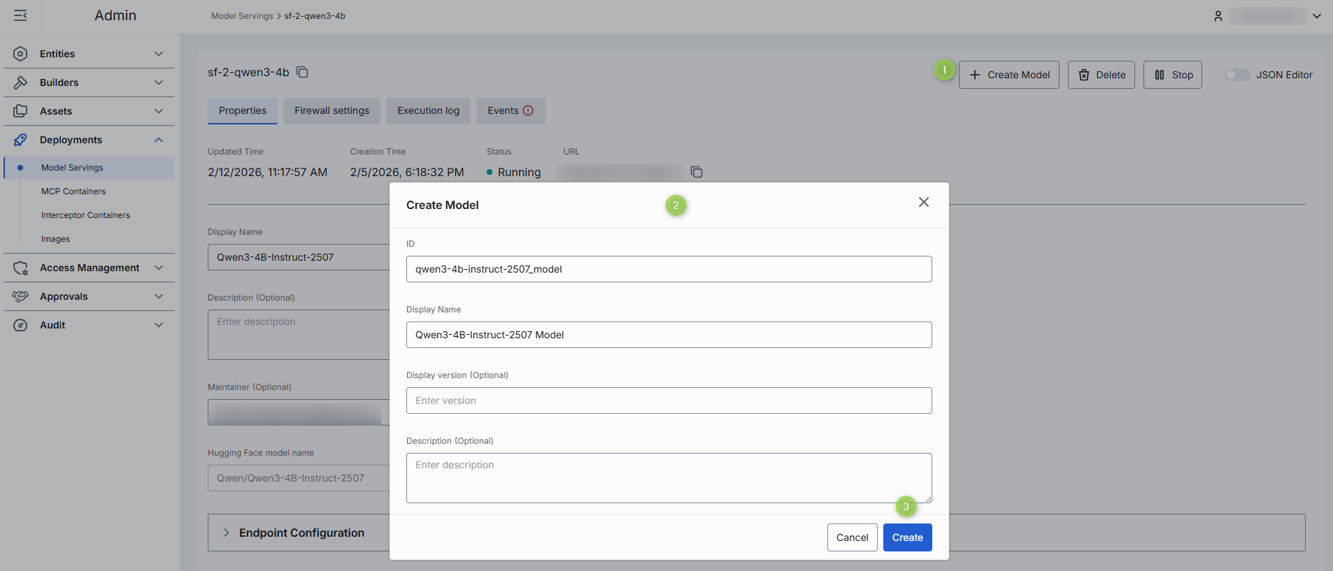 | Create Model | Available for running model servings. Click to create a new model deployment using this selected model serving. |