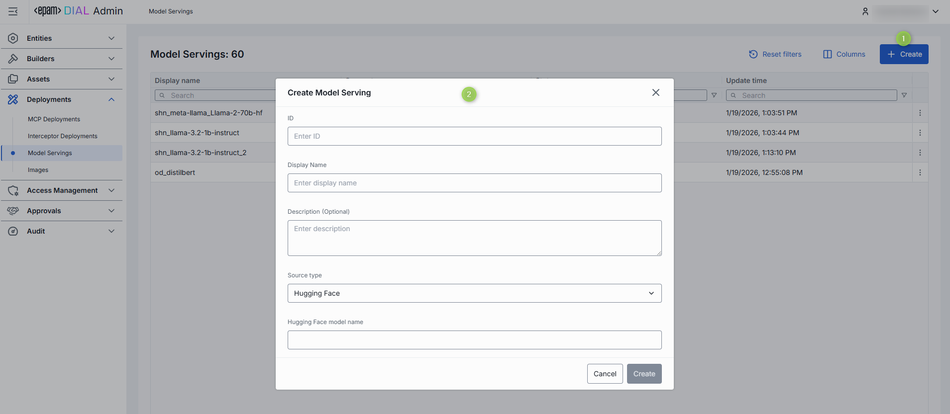 On the main screen, click the Create button to open the Create Model Serving form.