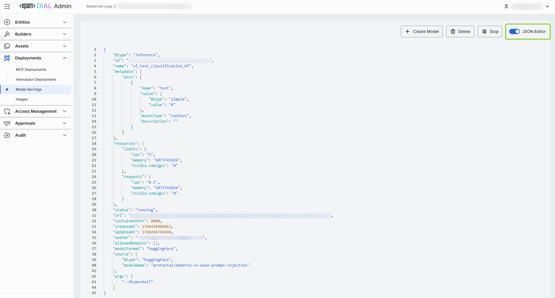 | Resources | No | Yes | Resource allocation settings for the model serving (CPU, Memory, GPU). |
