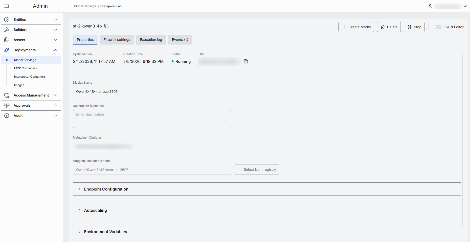 | Endpoint Configuration | No | Yes | Port configuration for the model serving. Note: Changes to these settings can be applied to a running container. Saving changes will trigger a restart in RollingUpdate mode. |