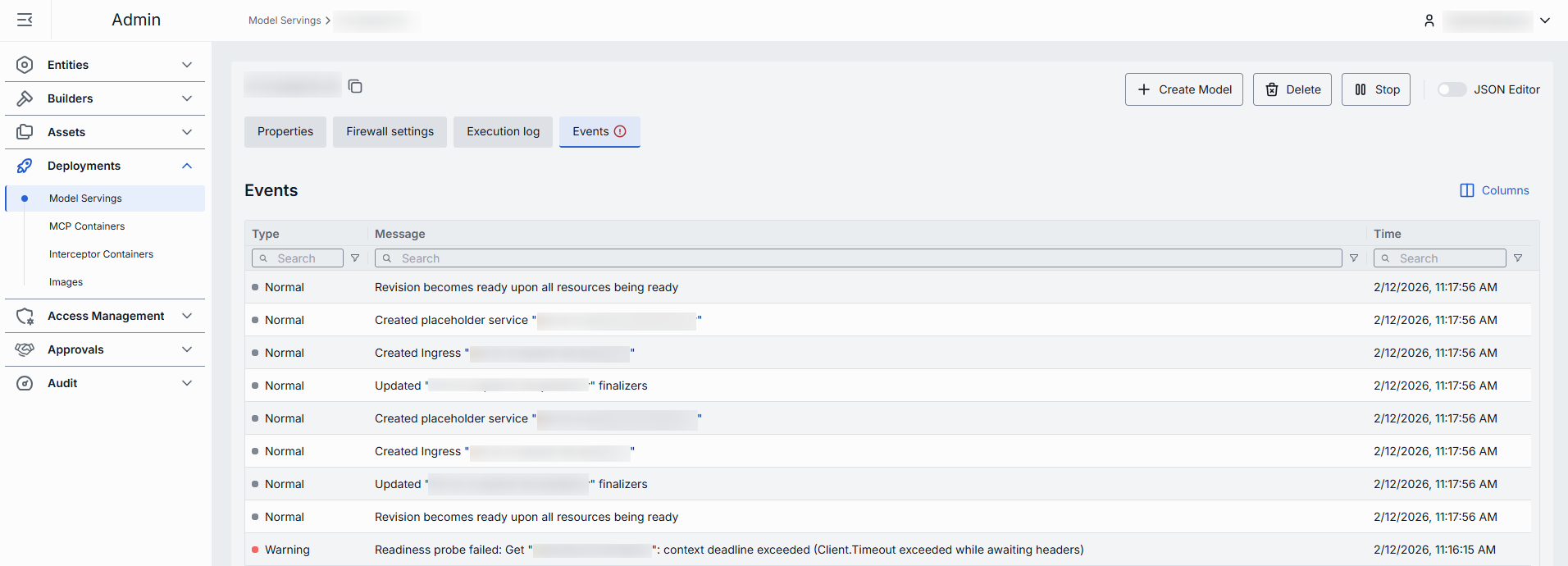 In the Events tab, you can view the event history related to the selected model serving.