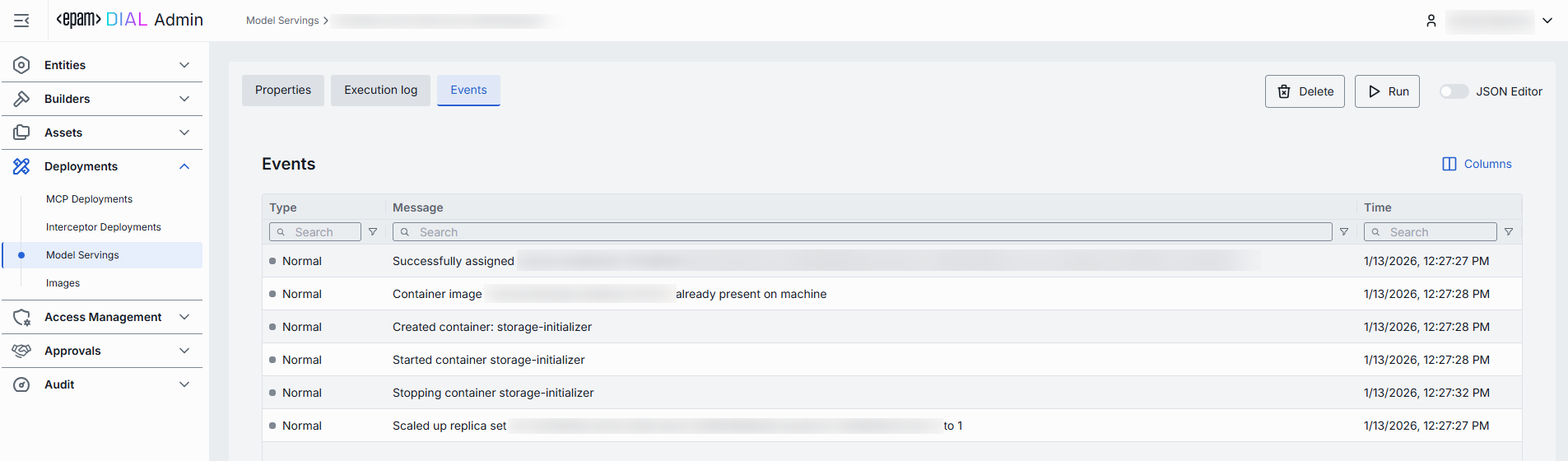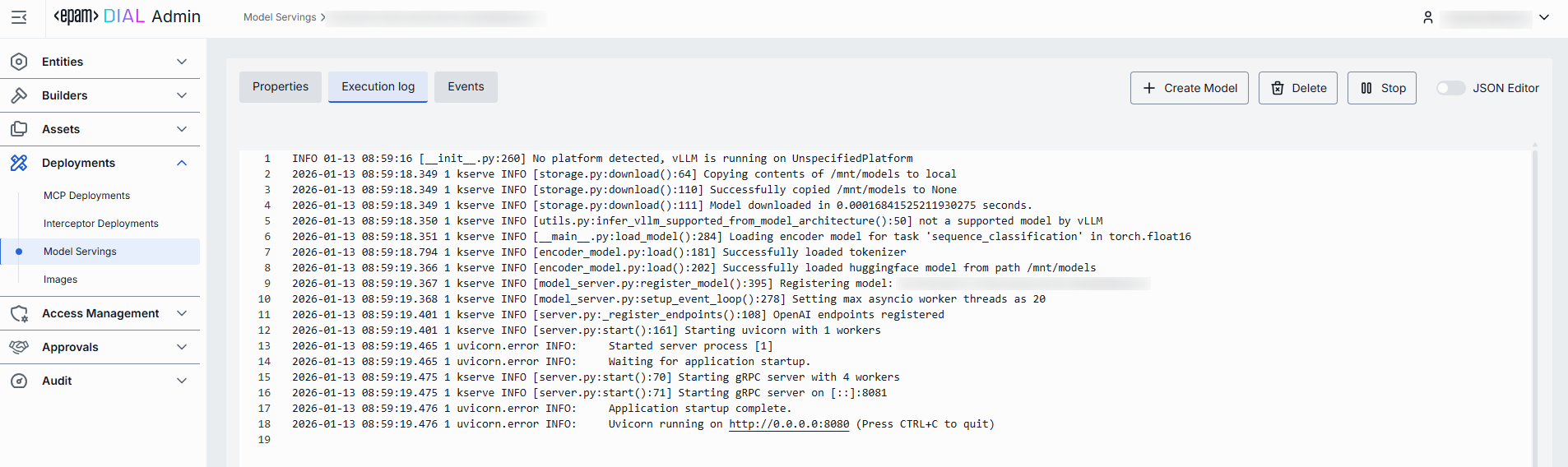 In the Execution Log tab, you can view the logs related to the operations and activities of the selected model serving.