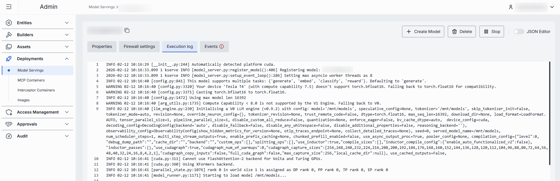 In the Execution Log tab, you can view the logs related to the operations and activities of the selected model serving container.