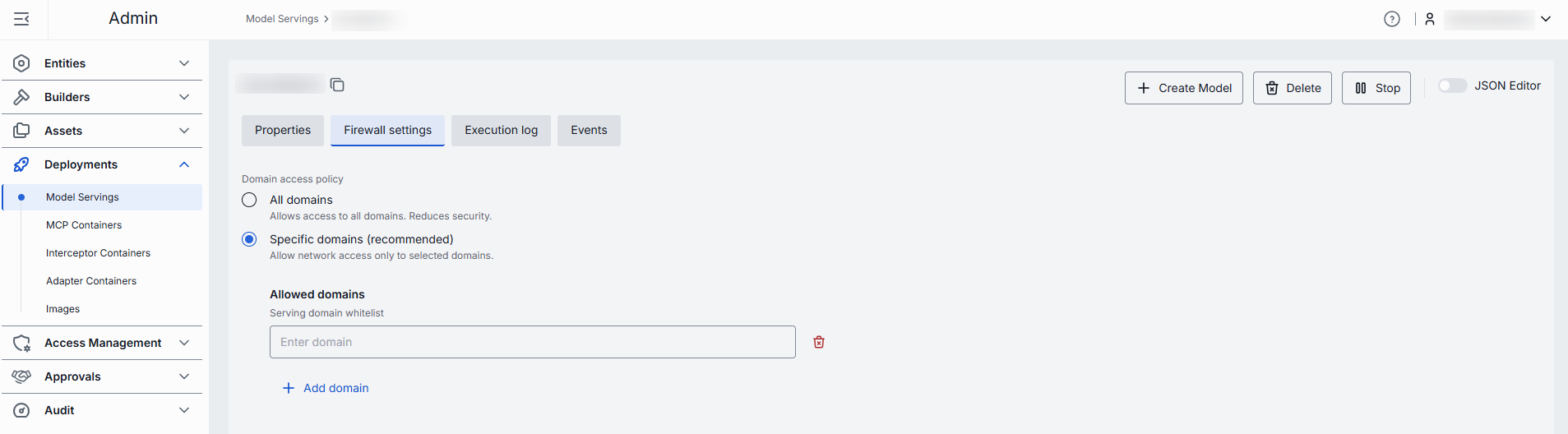 The whitelist domains setting specifies which external domains the model serving container is allowed to connect to. This setting controls outgoing traffic from the container, ensuring that it can only communicate with trusted domains (for example, your company’s website or specific client applications).