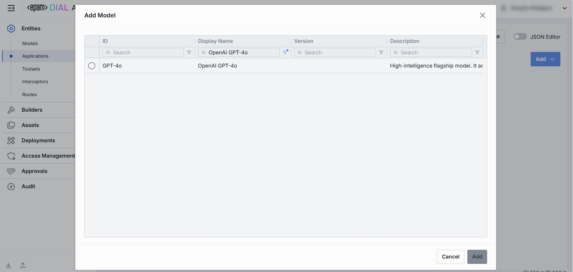 - In the modal window, choose model or application existing in DIAL from the grid.