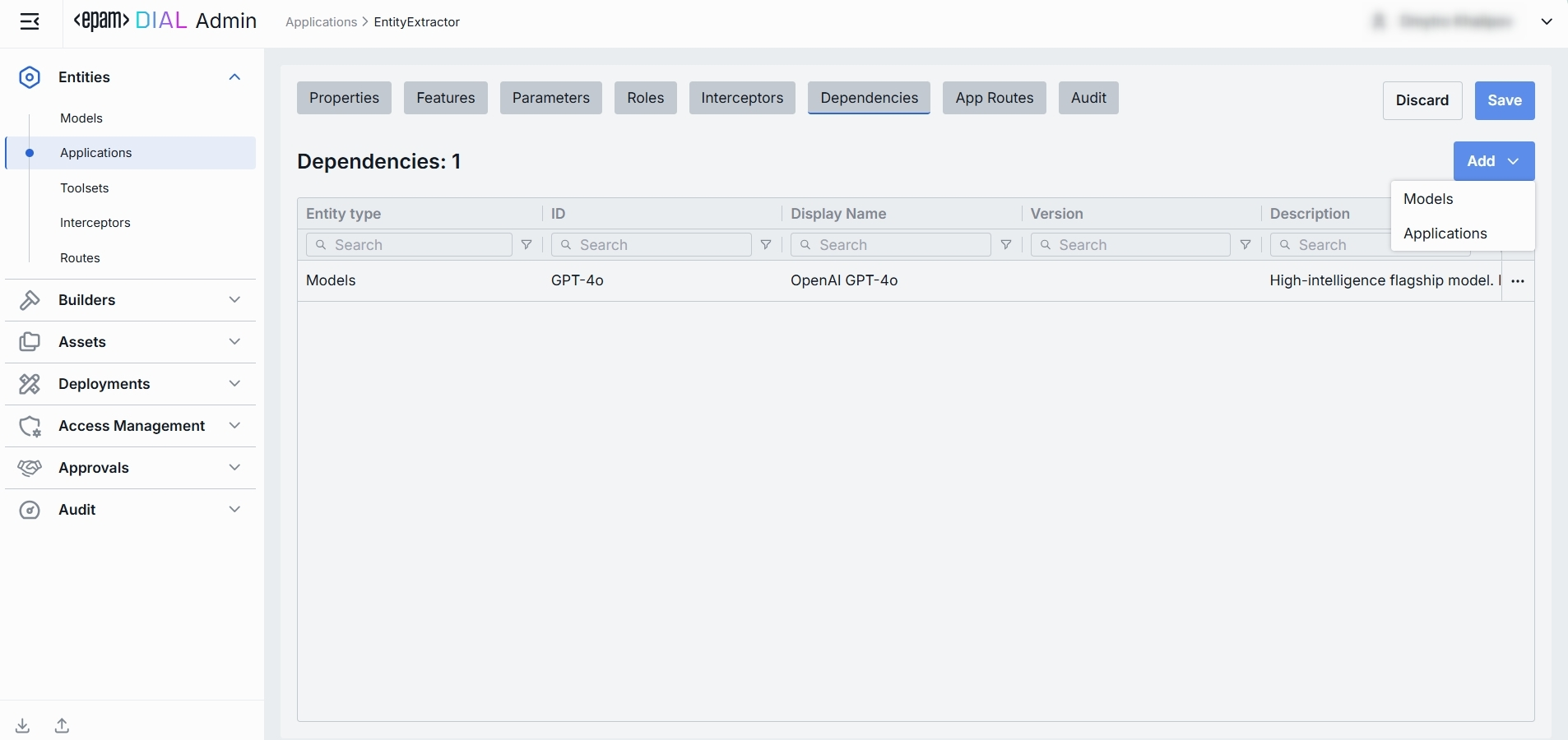 This tab lists other entities Models or Applications that the current Application depends on. Administrators can manually add new dependencies (by selecting from available Models and Applications) or remove the existing ones.