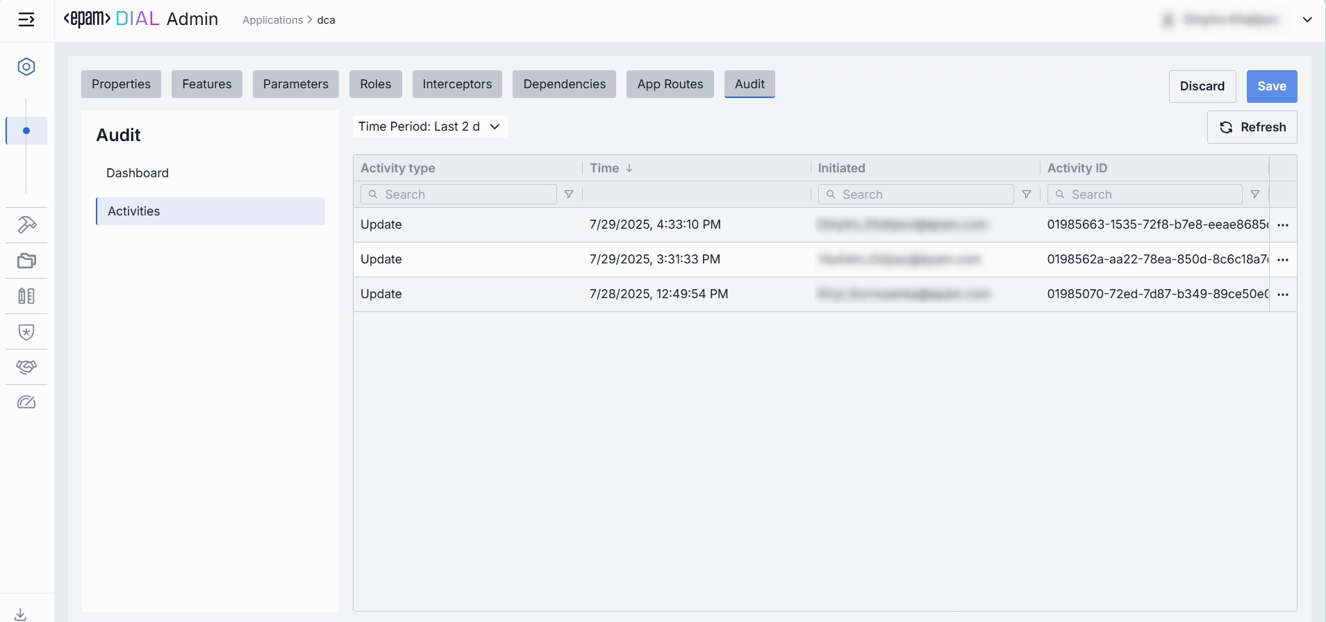 This section mimics the functionality available in the global Audit → Activities menu, but is scoped specifically to the selected app.