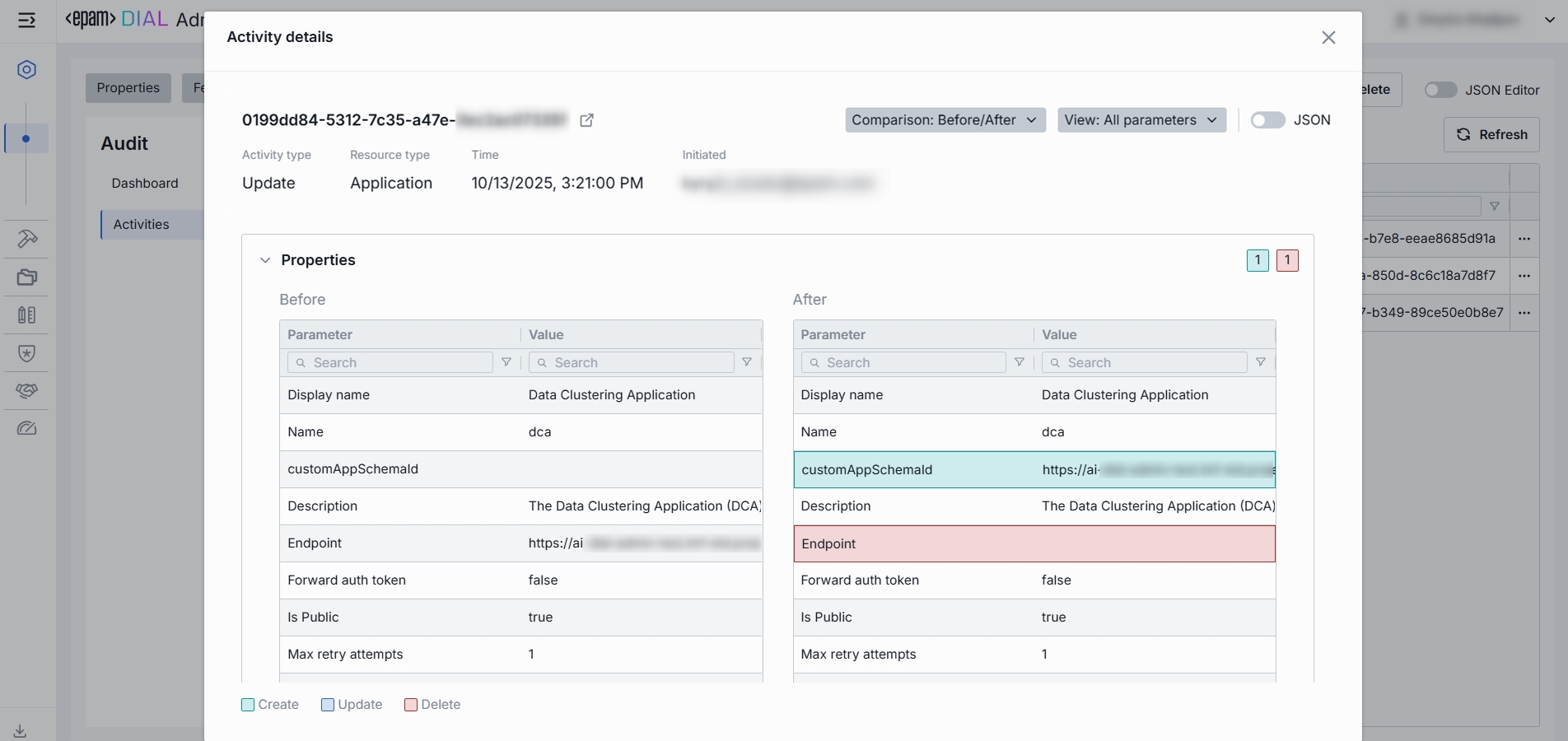 | Parameters Diff | Side-by-side comparison of app fields values before and after the change. Color-coding is used to indicate the operation type (Update, Create, Delete). |