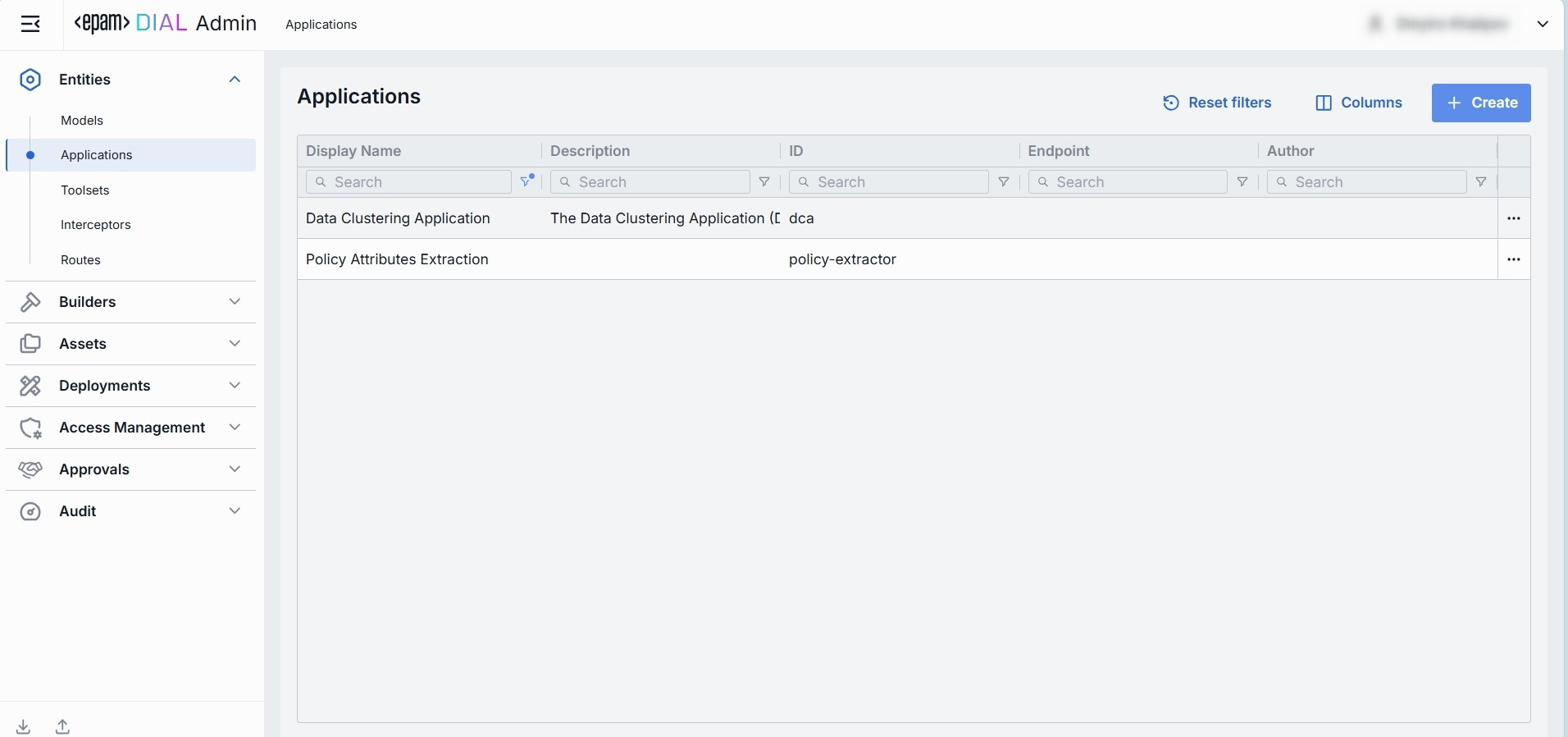 In Applications, you can see, create and manage applications deployed in your instance of DIAL.