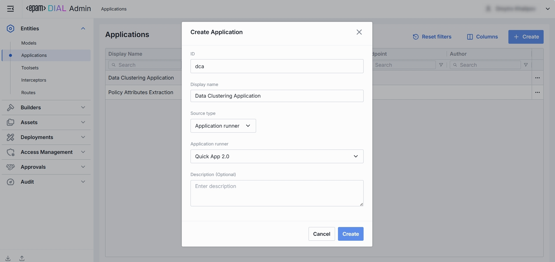 | Display Name | Yes | A user-friendly label shown on the UI (e.g. "Data Clustering Application"). Helps end user to identify and select applications. |