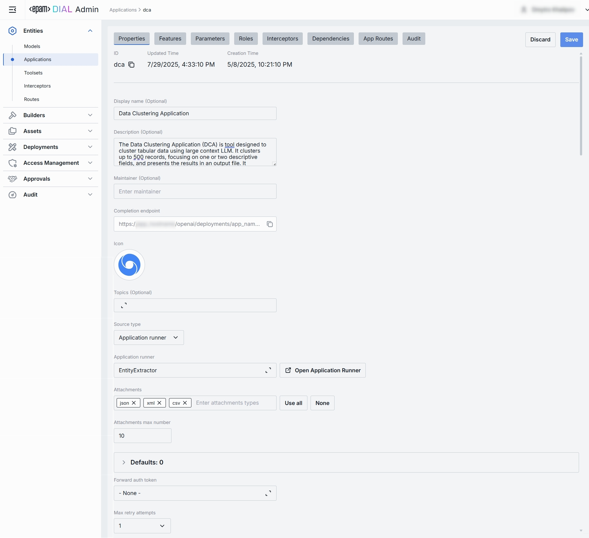 Display Name | Yes | A user-friendly label shown on the UI (e.g. "Data Clustering Application"). Helps end user to identify and select applications. |