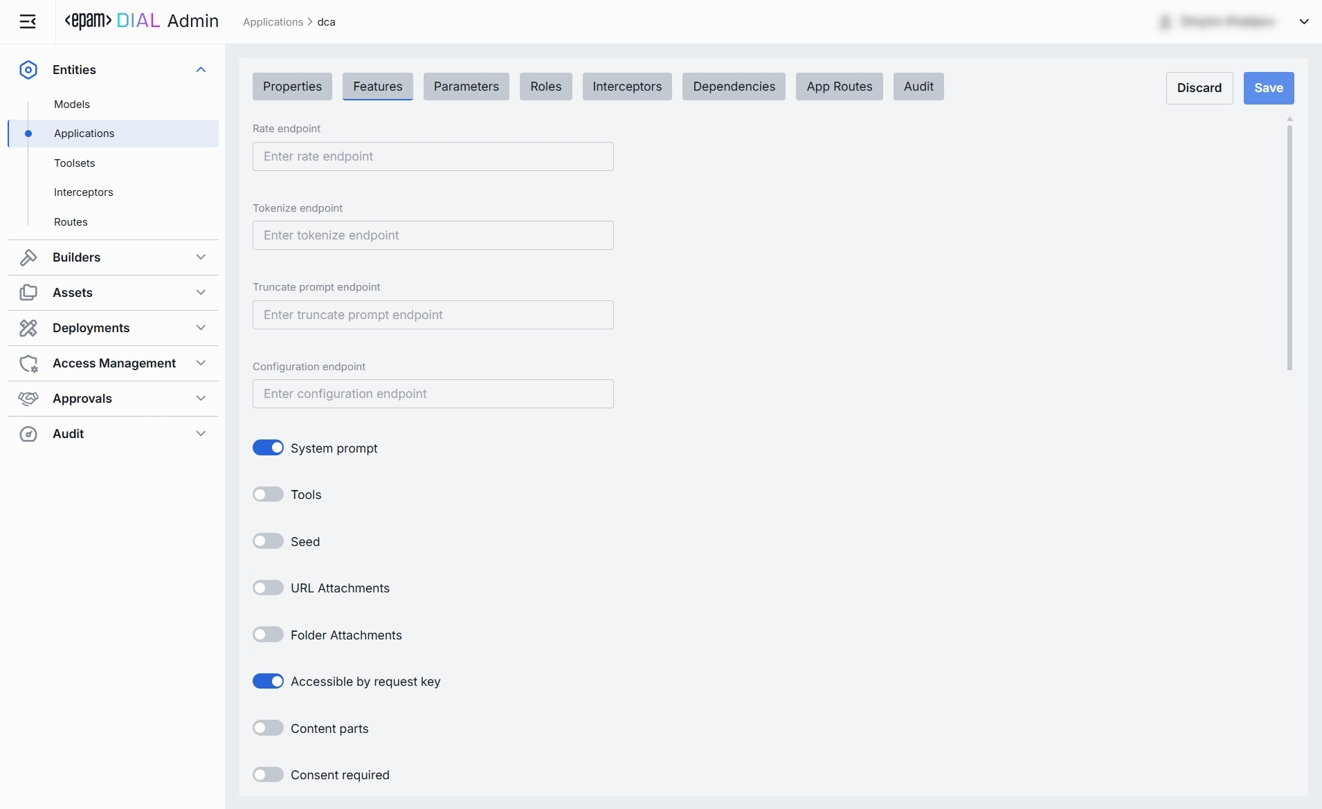 Viewer URL | Optional | Optional, needed only if Source Type is 'Endpoints'. An optional field with a URL of the application's custom UI. A custom UI, if enabled, will override the standard DIAL Chat UI. |