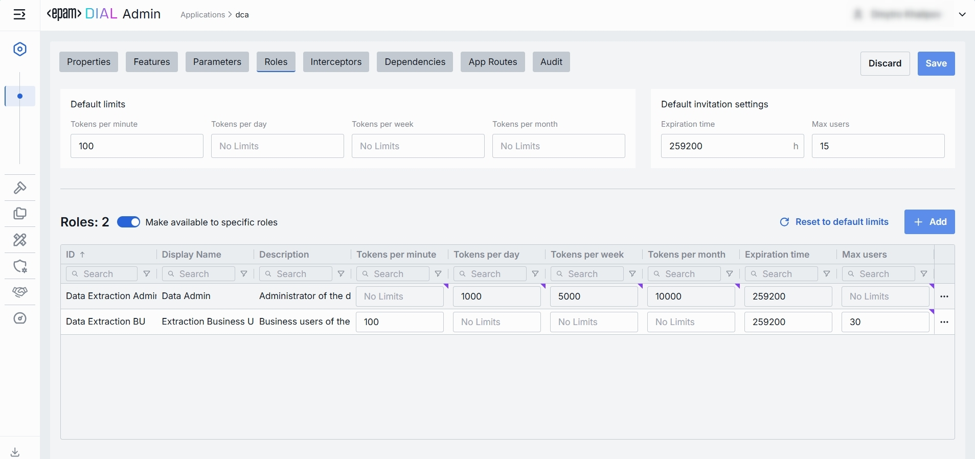 In the Roles tab, you can create and manage roles defined in the Access Management section. Here, you can define user groups that can use specific applications and define rate limits for them.