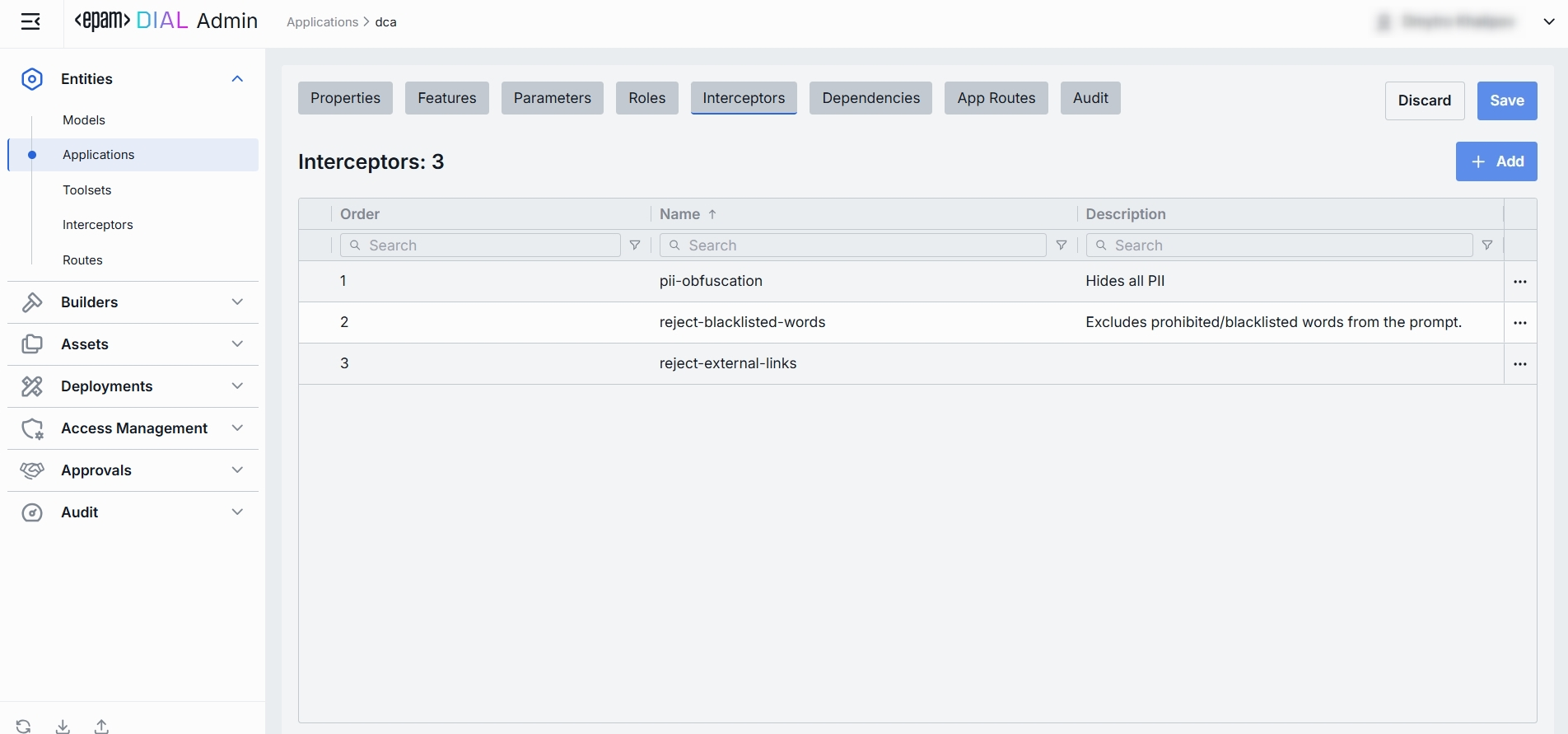 TIP: If you need a new interceptor, first create it under Entities → Interceptors and then revisit this tab to attach it to the application's configuration.