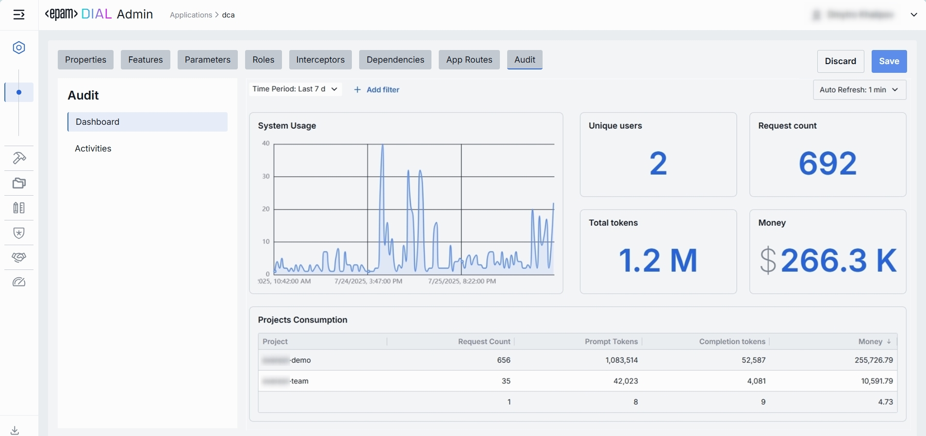 In the Dashboard tab, you can see real-time and historical metrics for the application. You can use it to monitor usage patterns, enforce SLAs, optimize costs, and troubleshoot anomalies.