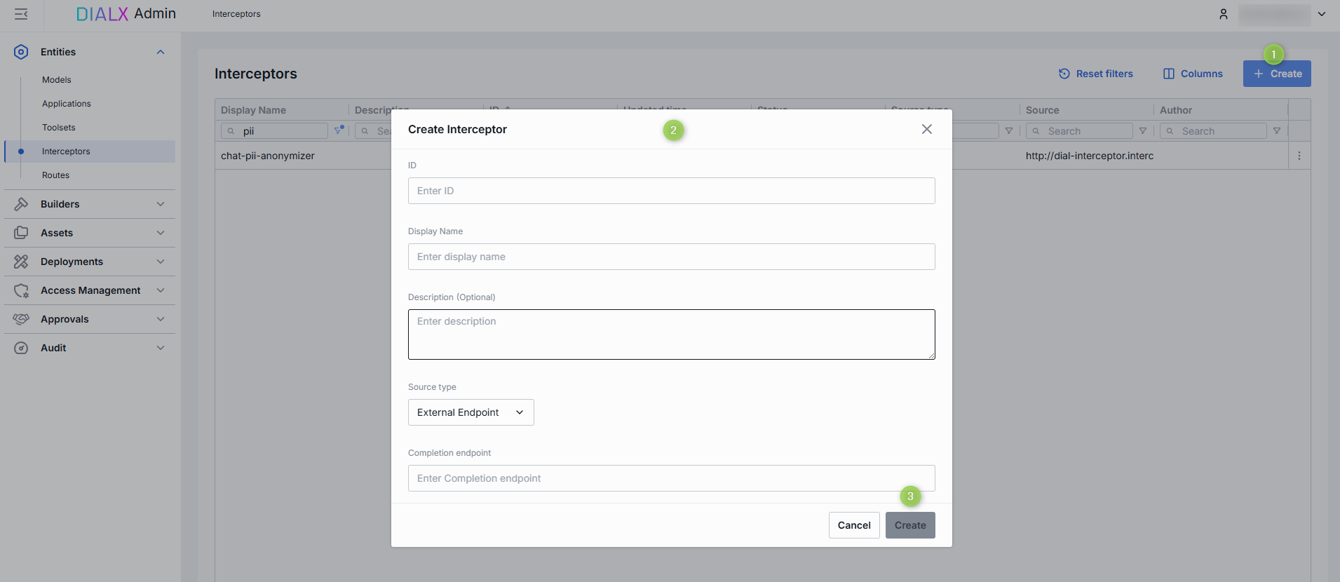 - External Endpoint: Interceptor is based on an external HTTP endpoint.Interceptor template Conditional Interceptor's Template Id. Applies for the Interceptor Template source type. Container Conditional Interceptor's Container Id. Applies for the Interceptor Container source type. Completion endpoint Conditional URL of the chat completion endpoint. Applies for the External Endpoint source type. -