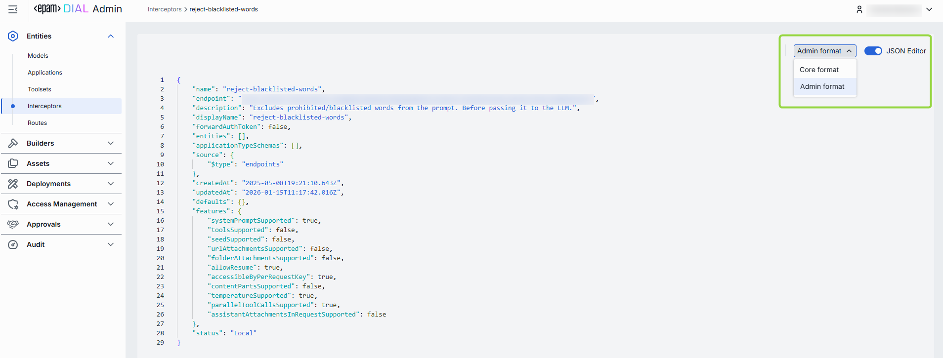 Advanced users with technical expertise can work with the interceptor properties in a JSON editor view mode. It is useful for advanced scenarios of bulk updates, copy/paste between environments, or tweaking settings not exposed on UI.