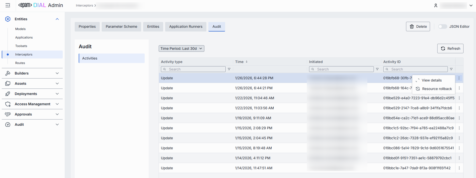 TIP: This section mimics the functionality available in the global Audit → Activities menu, but is scoped specifically to the selected interceptor.
