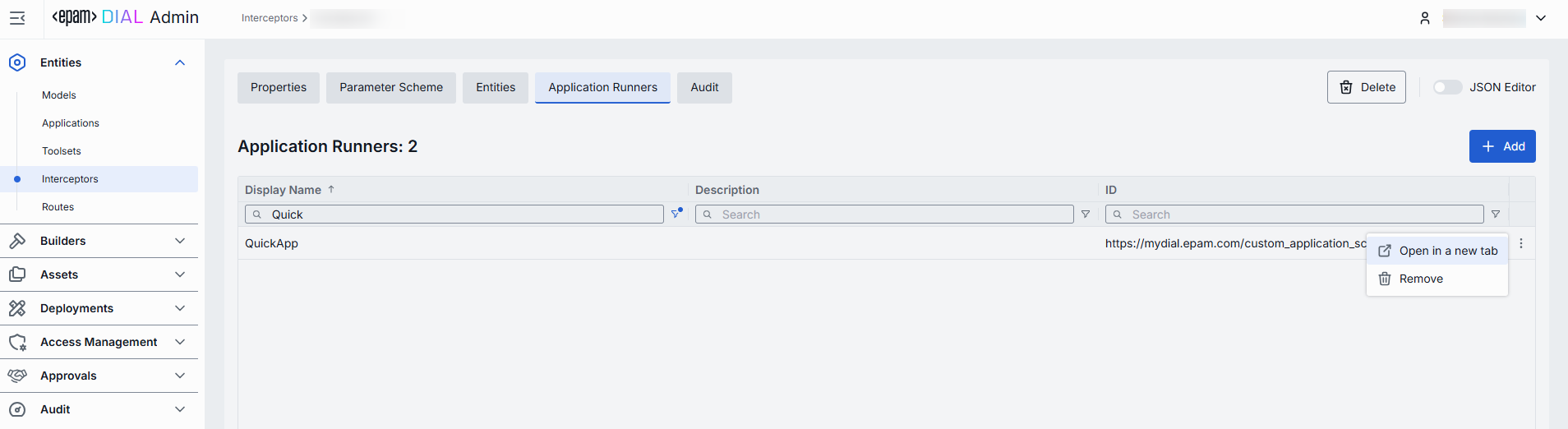 In the Entities tab, you can see Models and Applications this interceptor is currently associated with.