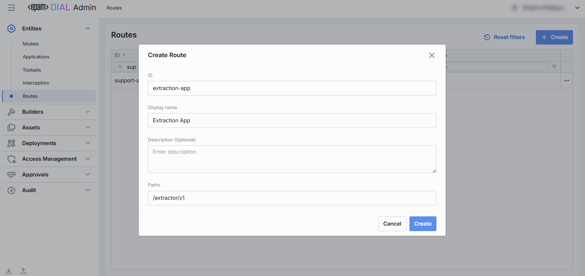 Click + Create to invoke the Create Route modal, where you can define rout's parameters: