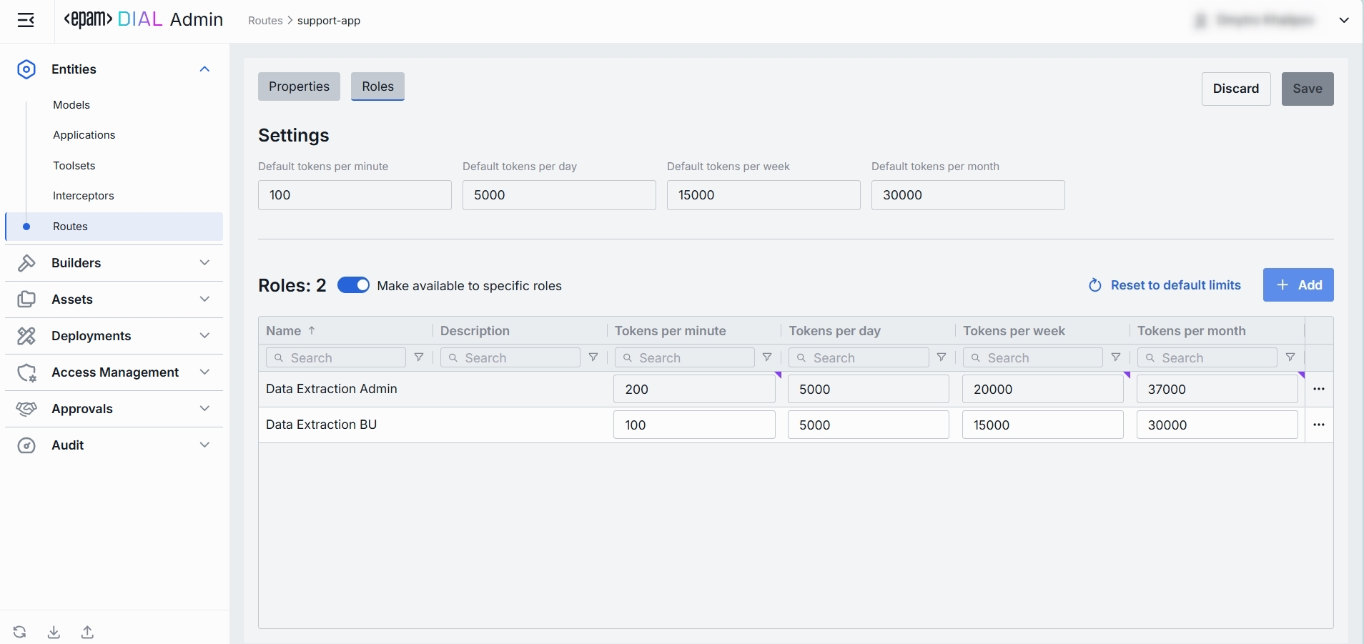 The grid on the Roles screen lists the roles that can access a specific route. Here, you can also set individual limits for selected roles. For example, you can give "Admin" role unlimited monthly tokens but throttle "Developer" to 100,000 tokens/day or allow the "External Partner" role a small trial quota (e.g., 10,000 tokens/month) before upgrade.