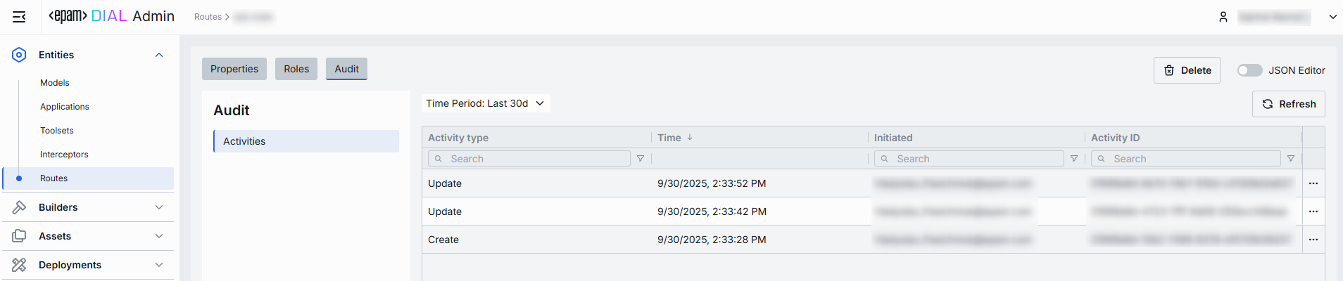 This section mimics the functionality available in the global Audit → Activities menu, but is scoped specifically to the selected route.