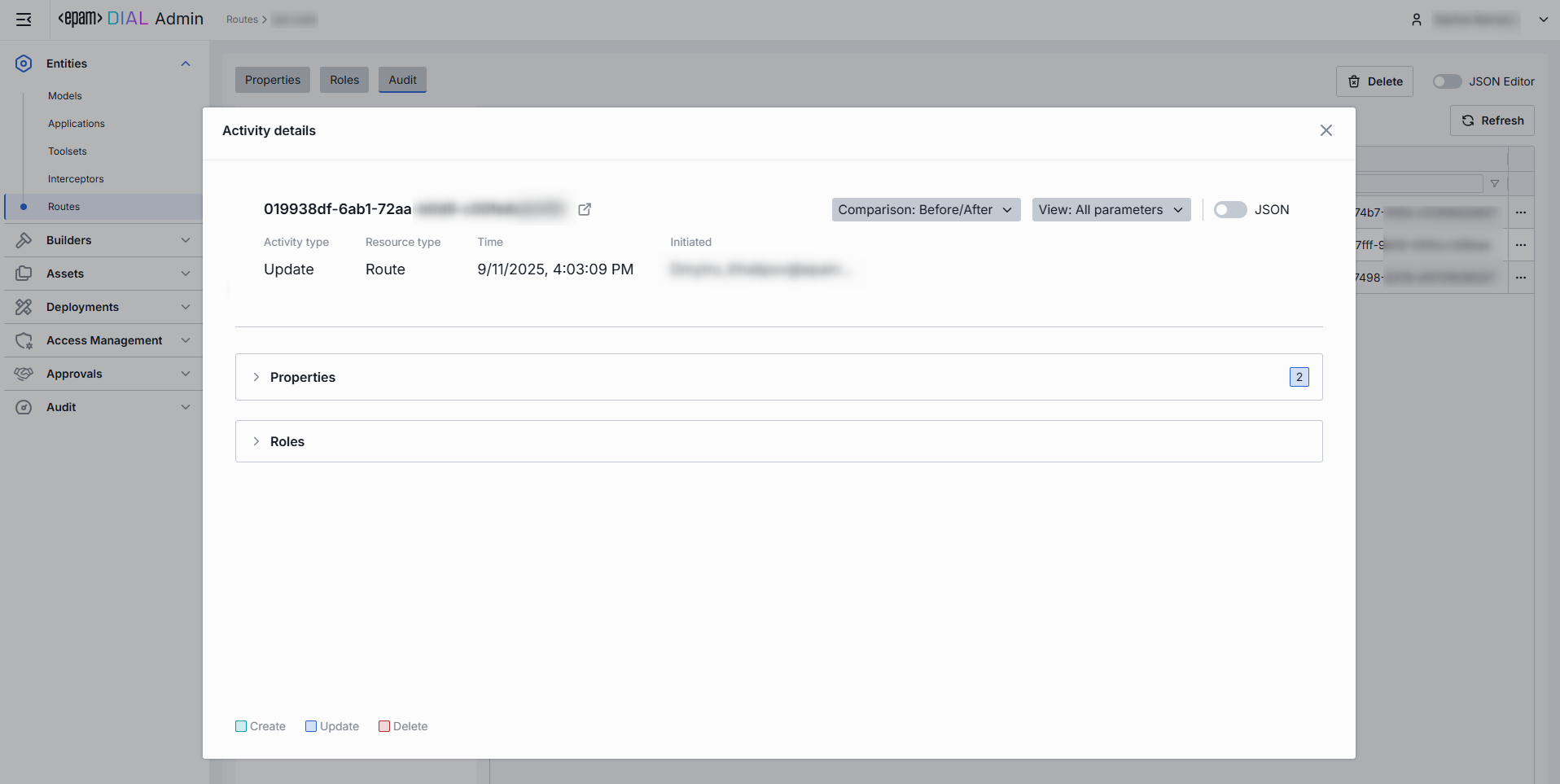 The Activity Details view provides a detailed snapshot of a specific change made to a route.