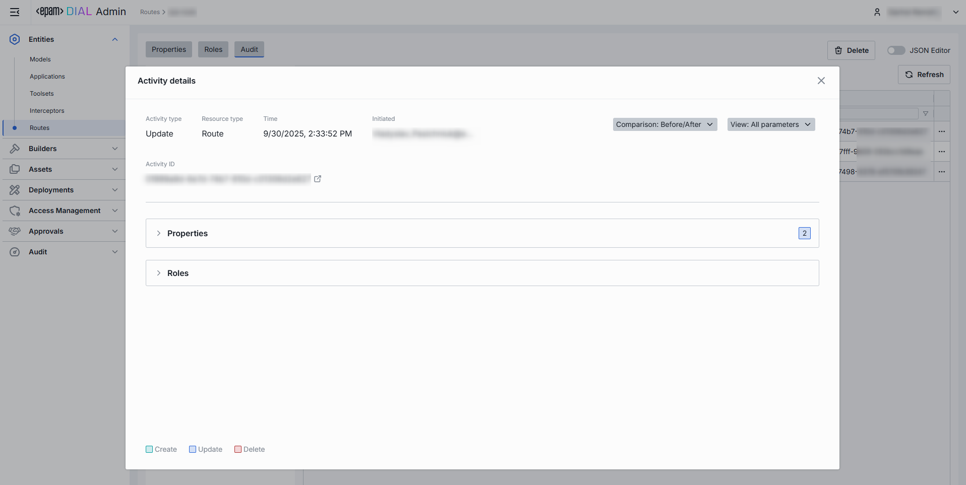 | Parameters Diff | Side-by-side comparison of toolset fields values before and after the change. Color-coding is used to indicate the operation type (Update, Create, Delete). |