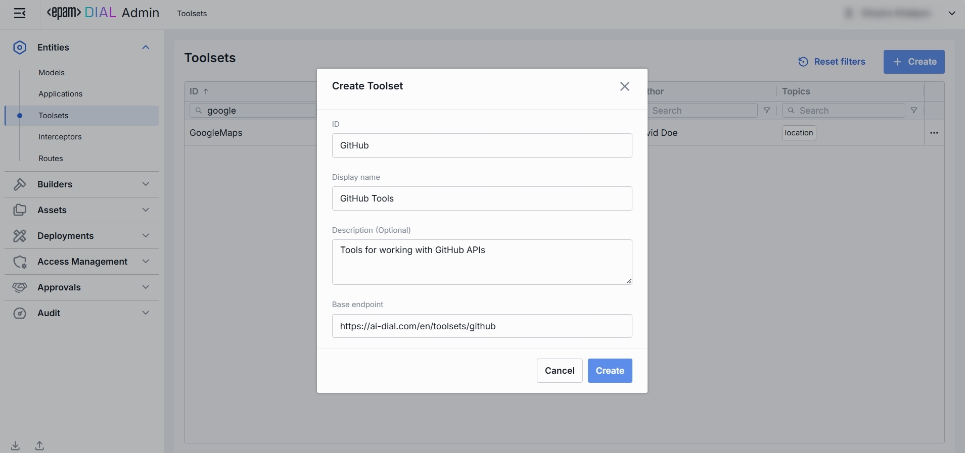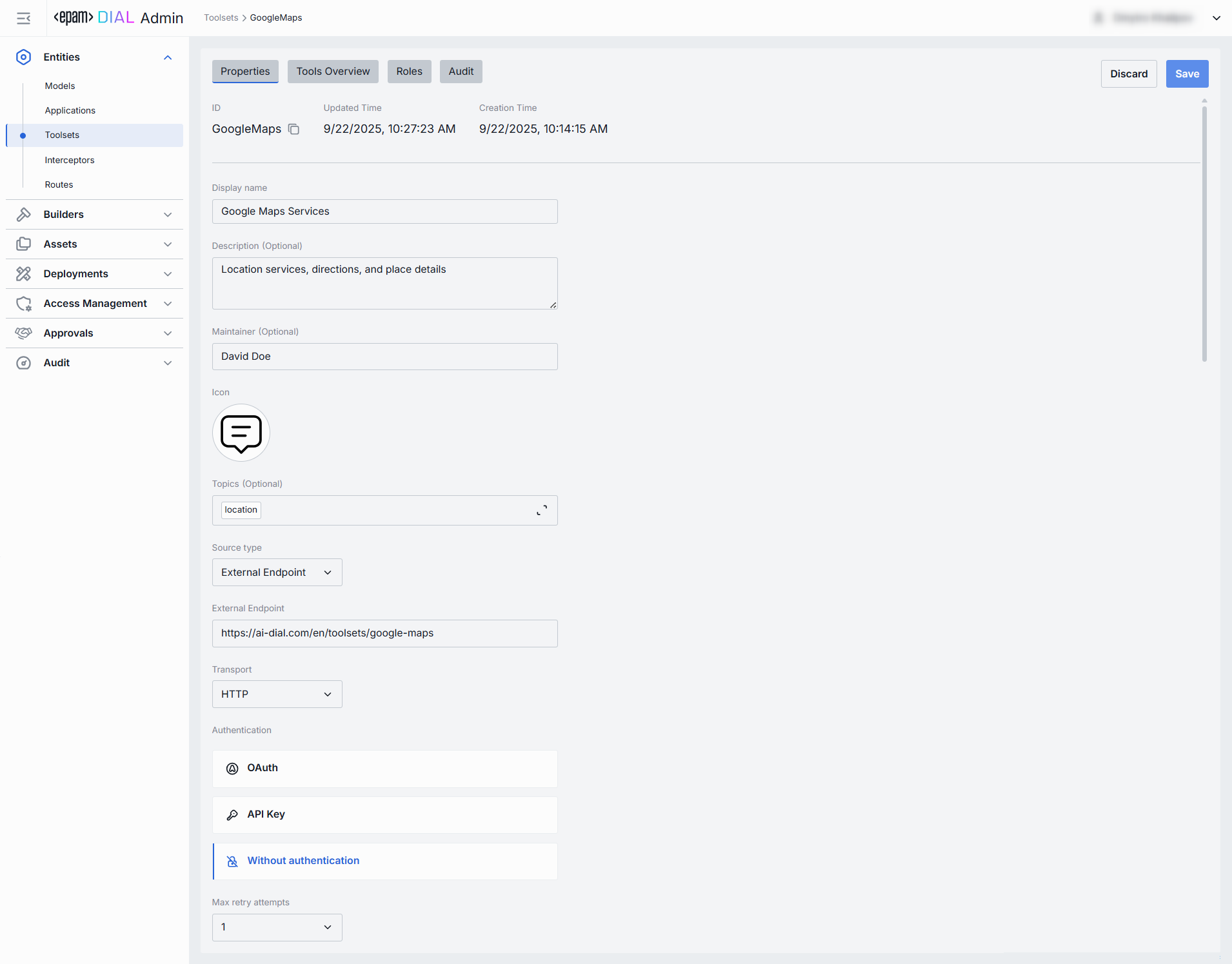 | Display Name | A user-friendly label for a toolset (e.g. GitHub, Google Maps). |