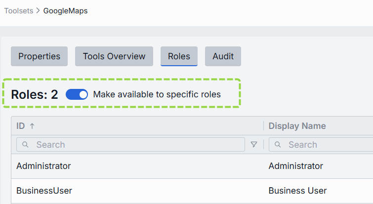 - Off: Toolset is callable by any authenticated user. All existing user roles are in the grid.