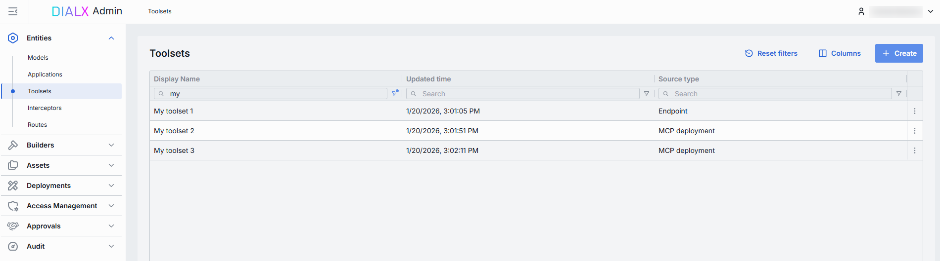 On this screen, you can find all toolset deployments existing in your DIAL instance that were added via a direct modification of DIAL Core config file or via DIAL Admin. Here you can view, filter, and add new toolset definitions.