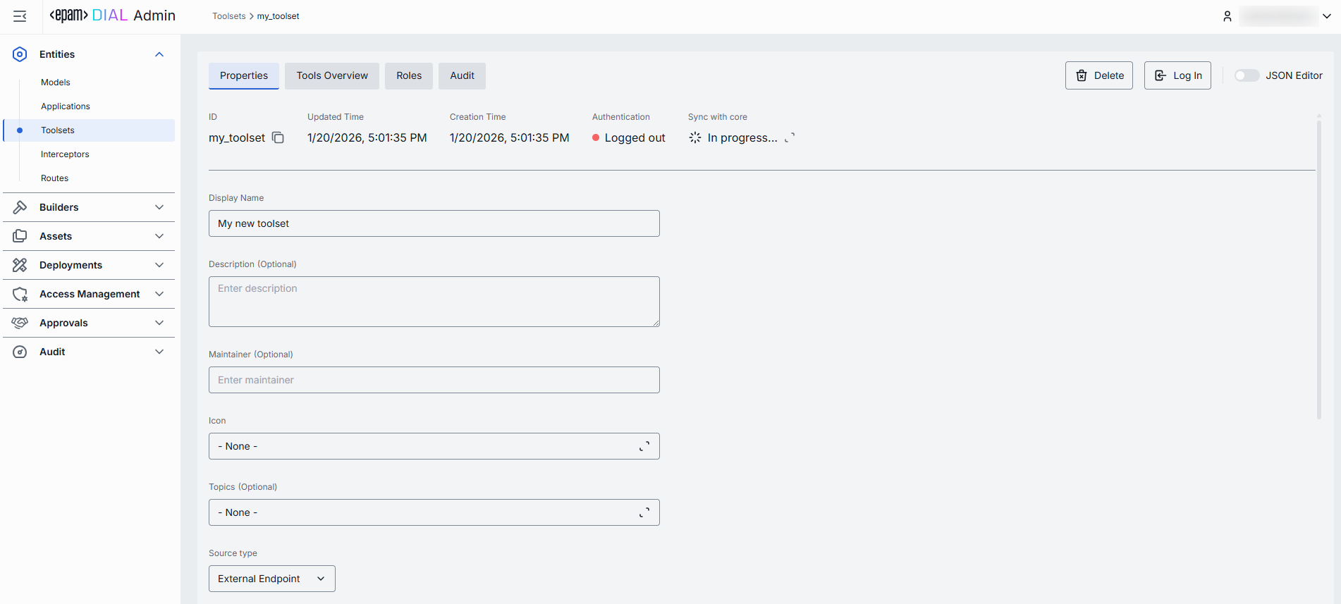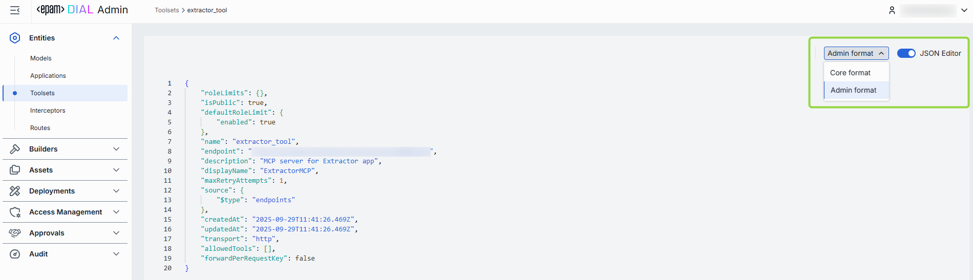 - Navigate to Entities → Toolsets, then select the toolset you want to edit.