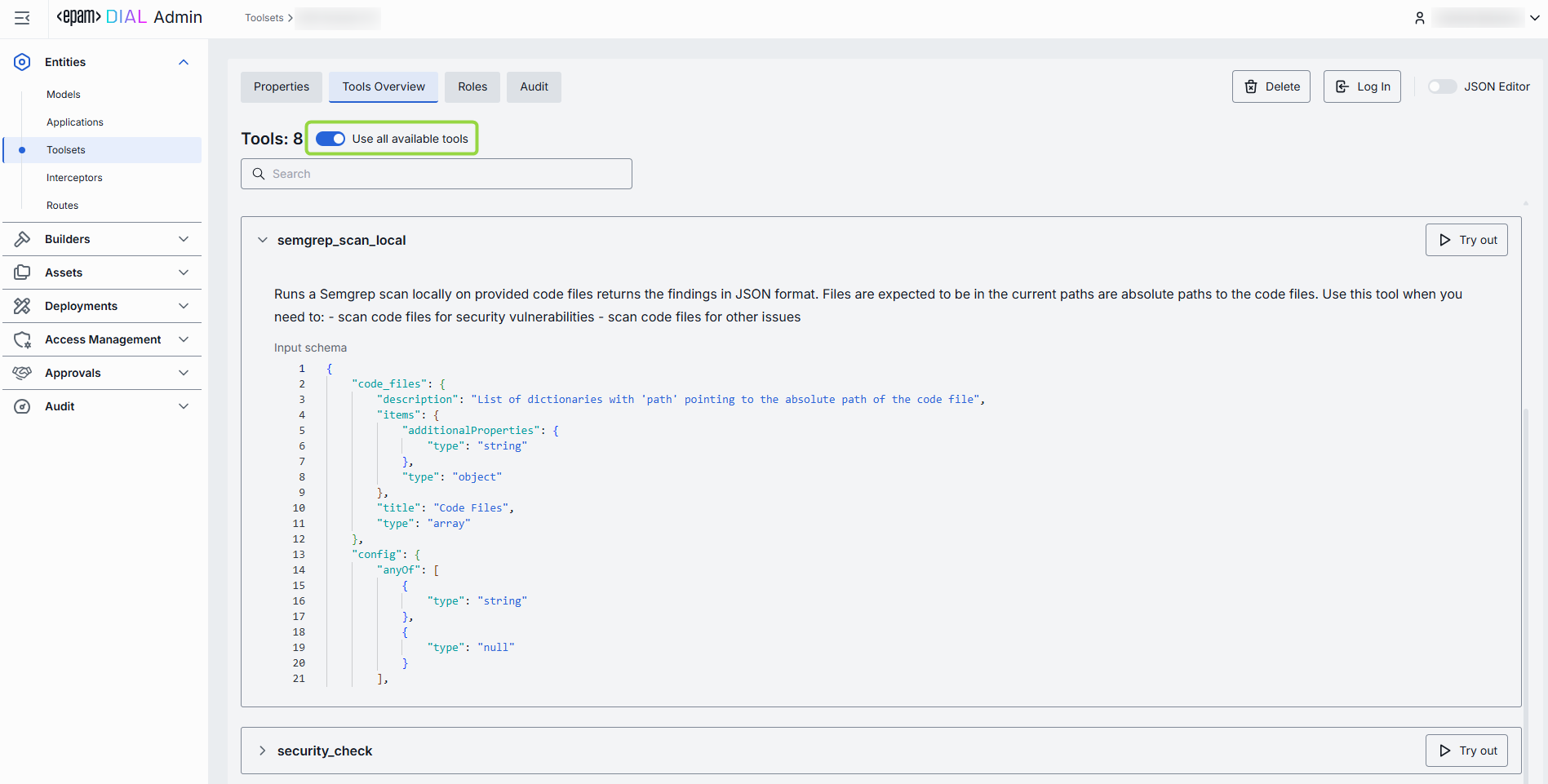 In case your toolset was created based on the MCP container deployed in DIAL, the content of this screen is inherited from the related MCP container.