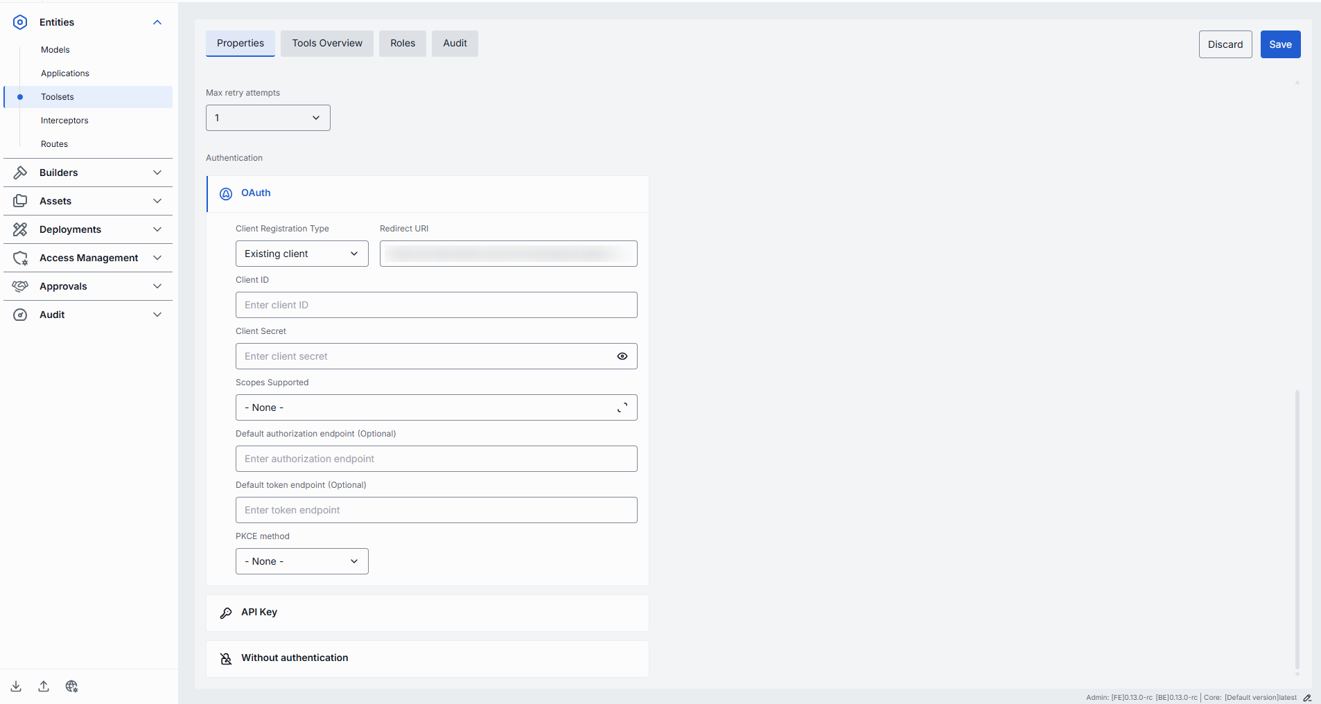 | Authentication | Yes | Yes | Toolset authentication configuration. |