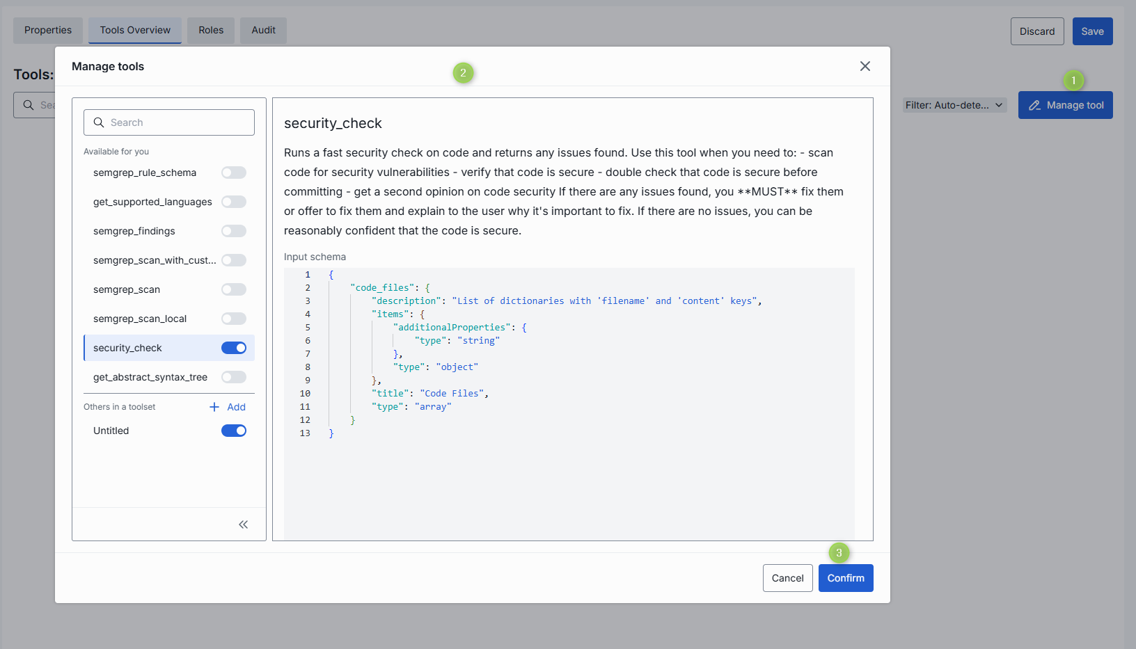 - Disable Use all available tools toggle and click Manage tool button to open the Manage tools modal.