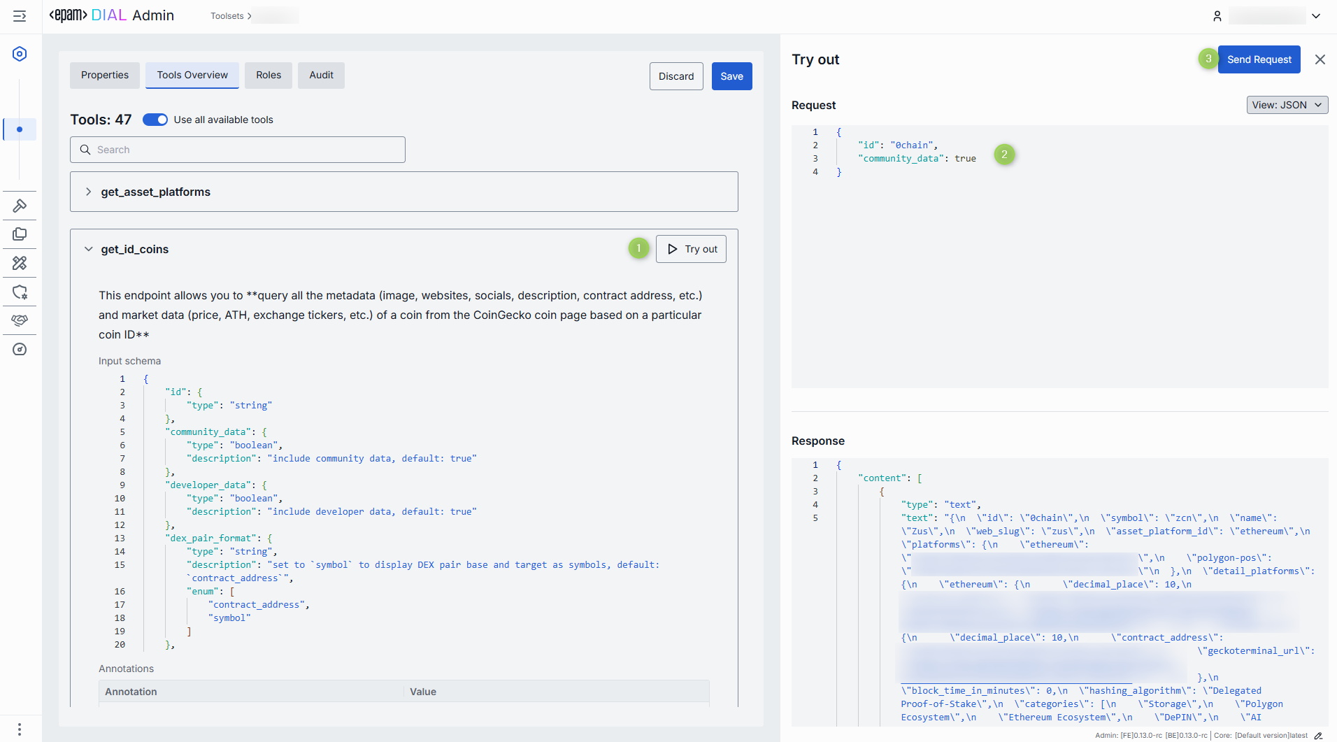 In the Try out mode, you can test each enabled tool by sending a sample request to the server. When sending a request, you can use the rendered UI form to populate the request input fields or enter JSON view mode to get access to all the fields supported by the input schema.