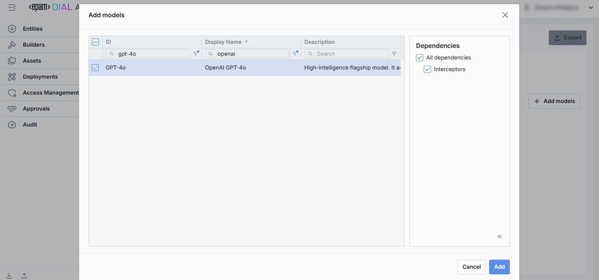- Entities: In this section, you can configure all language models, applications, toolsets, interceptors and routes within the DIAL environment. Go to Entities to learn more.
