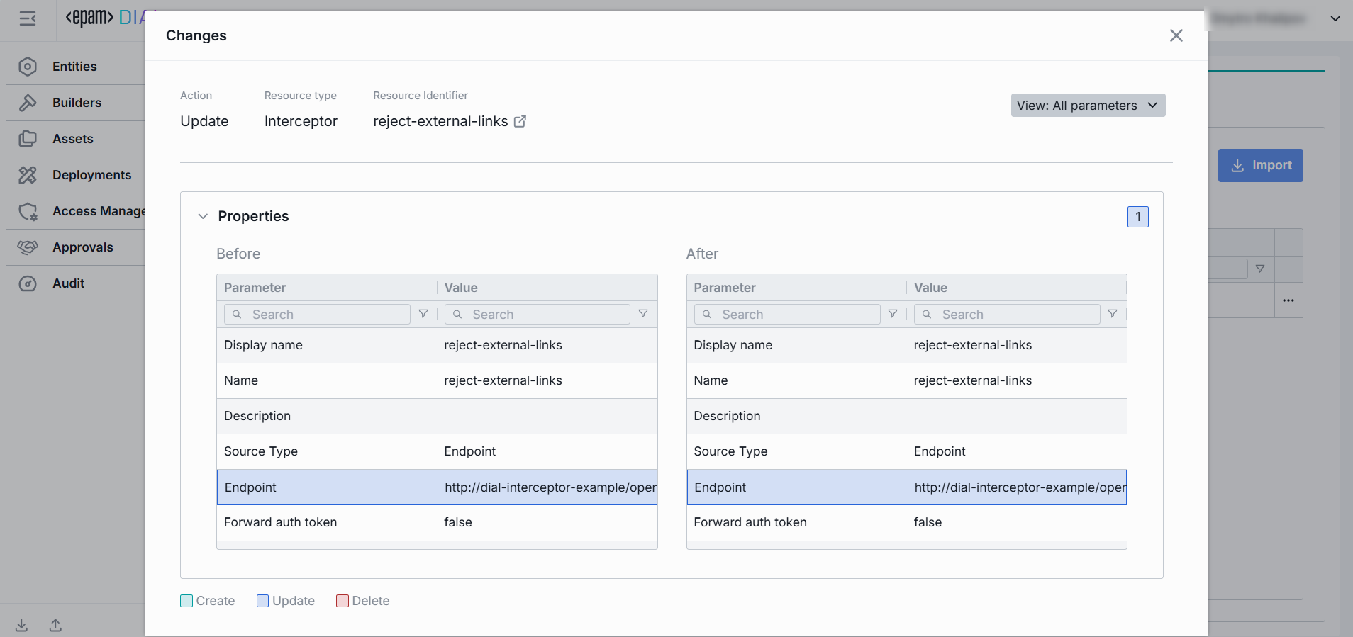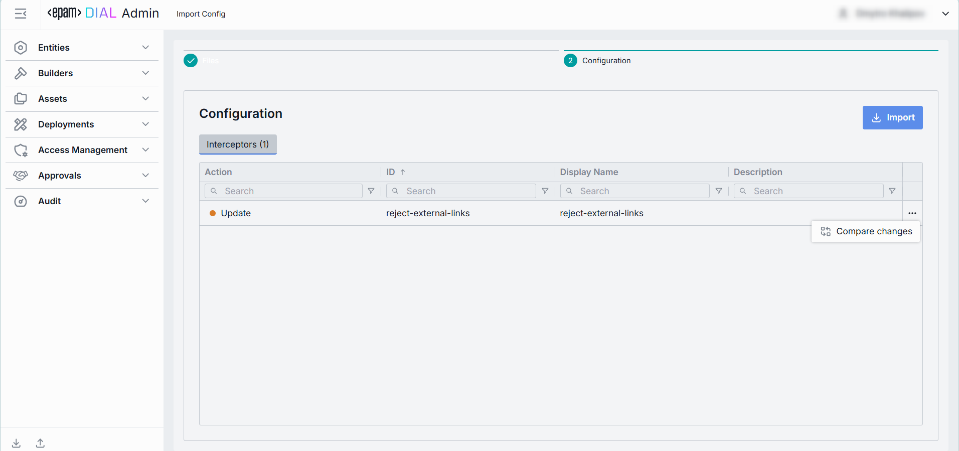 Click Compare changes in the artefact row to view the differences between the artefact already in DIAL and the one being imported: