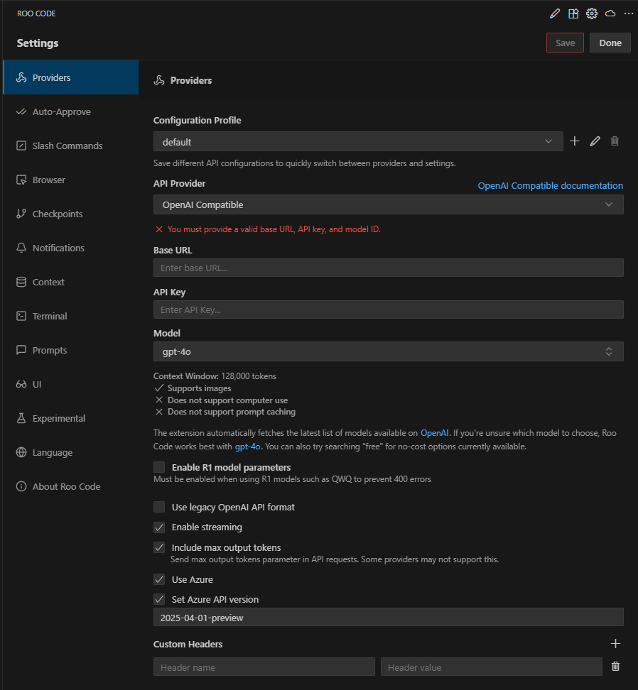 Roo Code configuration basically comes down to configuring Roo Code extension for VS Code to work with DIAL models: