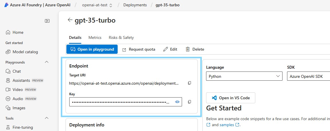 In Azure AI Foundry, click Deployments in the navigation menu, and open the model you deployed. In the Endpoint section you can find your Target URI and Key that you will need to provide in AI DIAL configuration file.