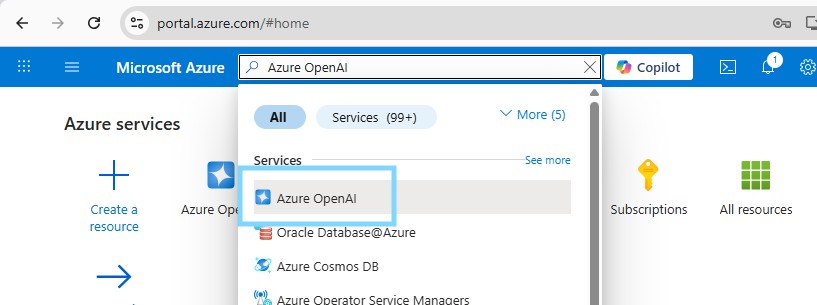 Use the search bar to look up Azure OpenAI and click it to navigate to the AI Foundry | Azure OpenAI page.