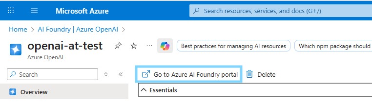 You can now find your OpenAI resource in the Azure OpenAI section. Click it to open and then click Go to Azure AI Foundry portal in the top bar.