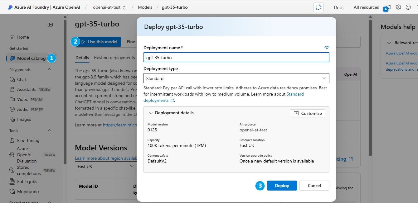 In Azure AI Foundry, click Model catalog in the navigation menu. Search for needed model, open it and click Use this model. Fill in the required fields and click Deploy to deploy a model.