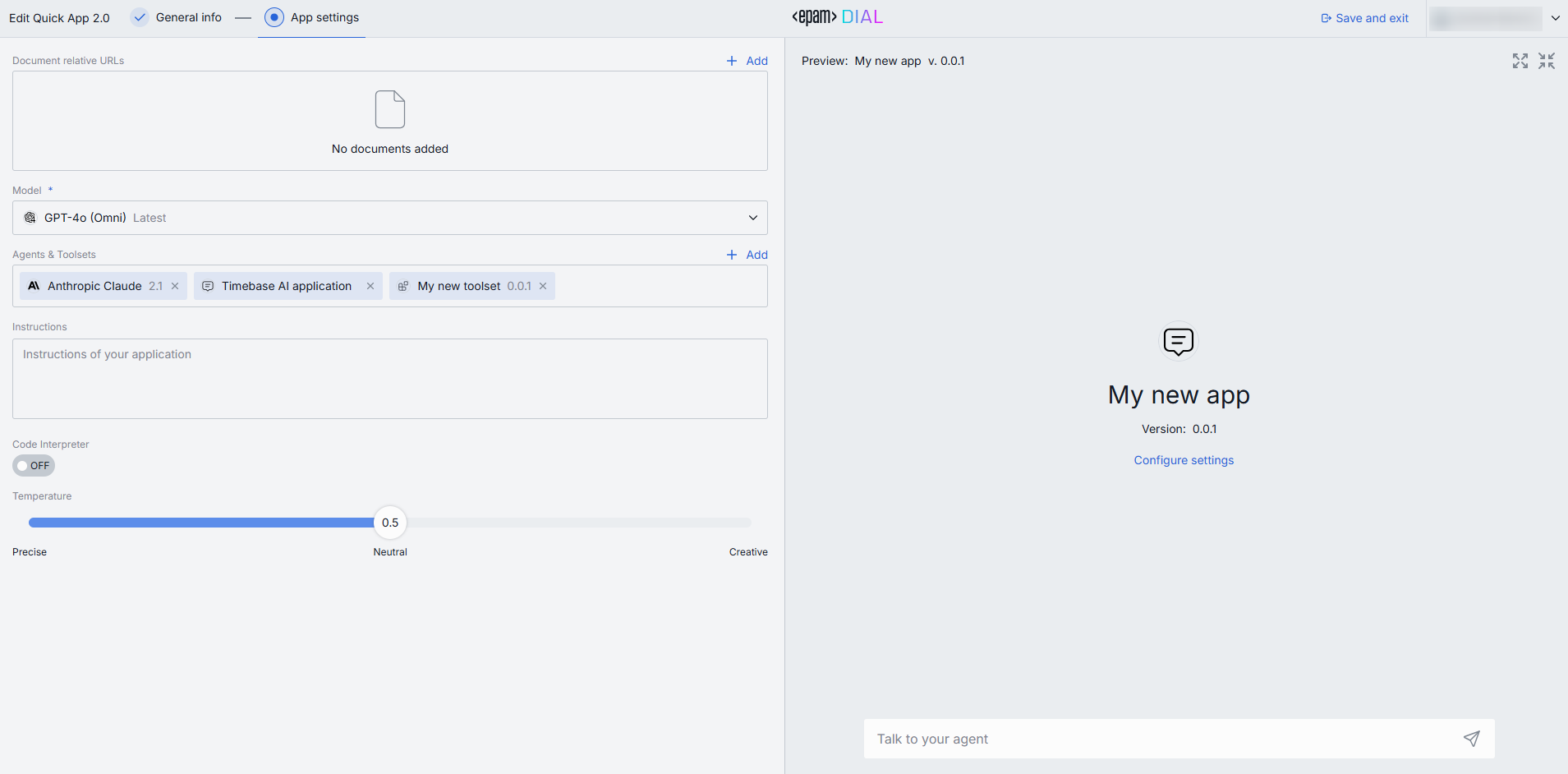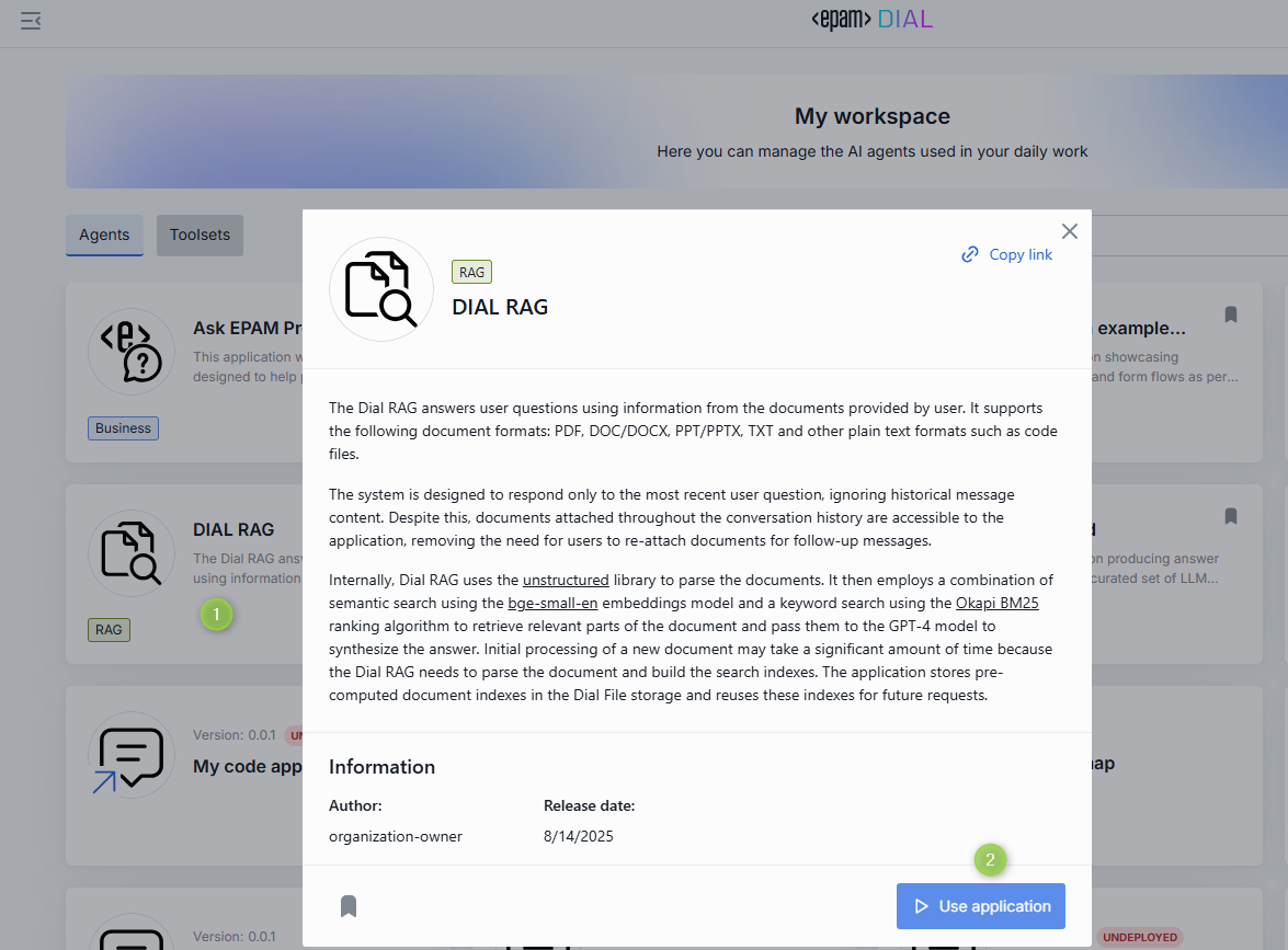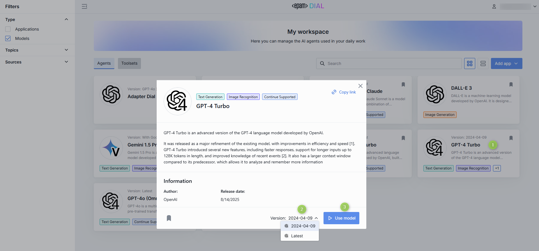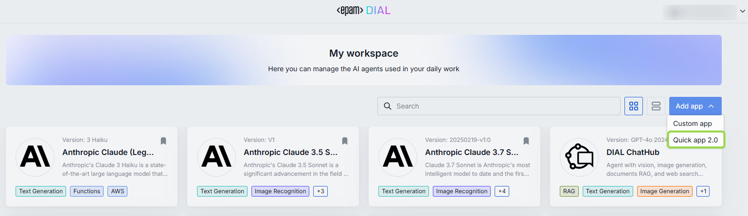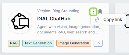 In DIAL Chat you can have a conversation with agents: language models and applications. You can access all the available agents in DIAL Marketplace and add them to your workspace.
