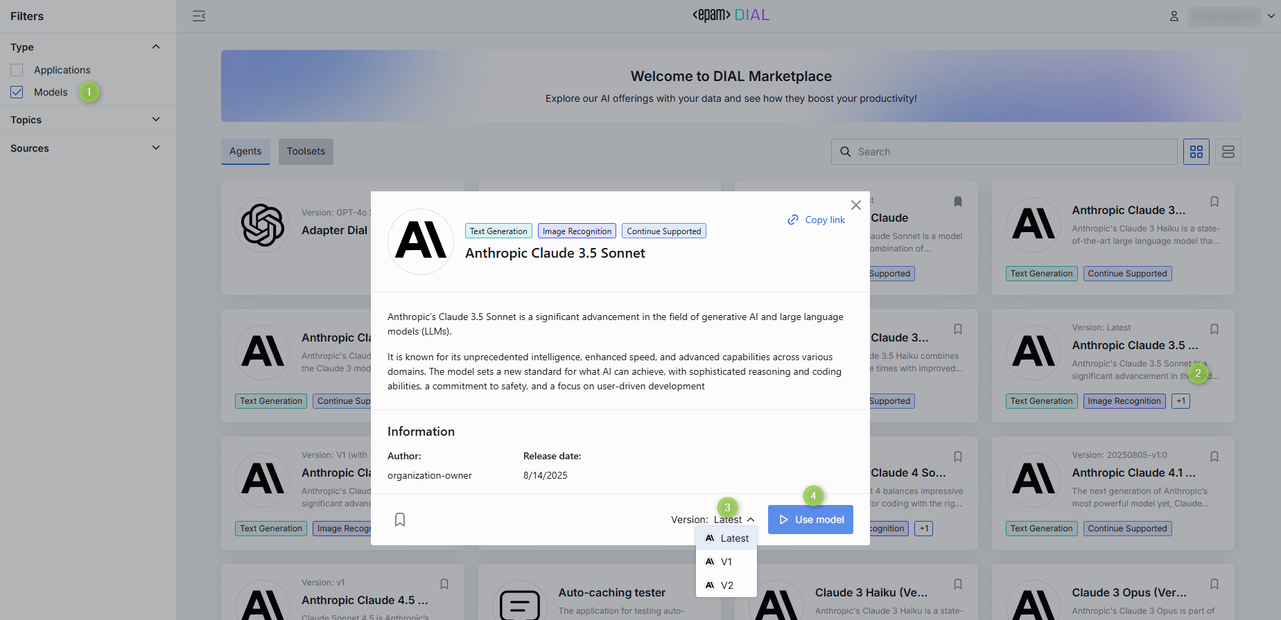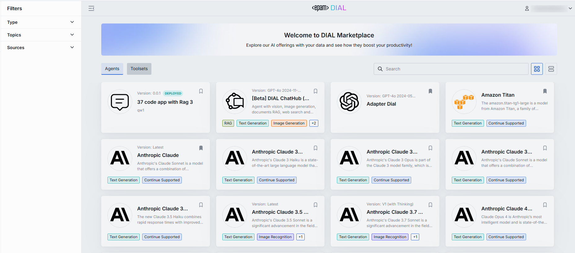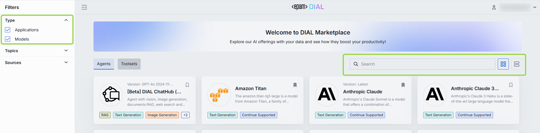 - DIAL Marketplace: Marketplace displays all conversational agents (applications and language models) available on your DIAL environment.
