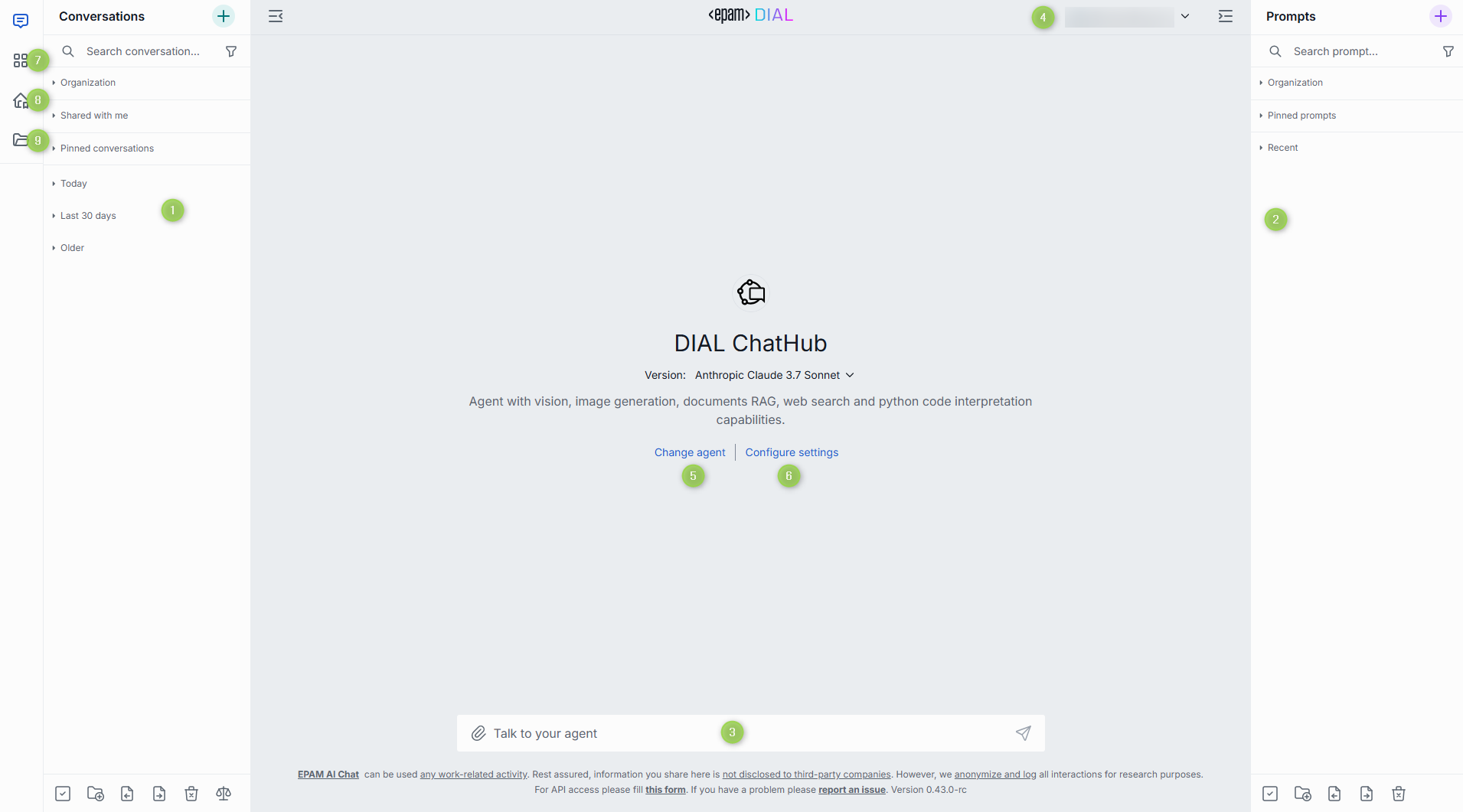 - Conversation settings: By default, this section displays the last conversational agent used by the user. In this section, you can modify settings of the selected agent or change the agent.